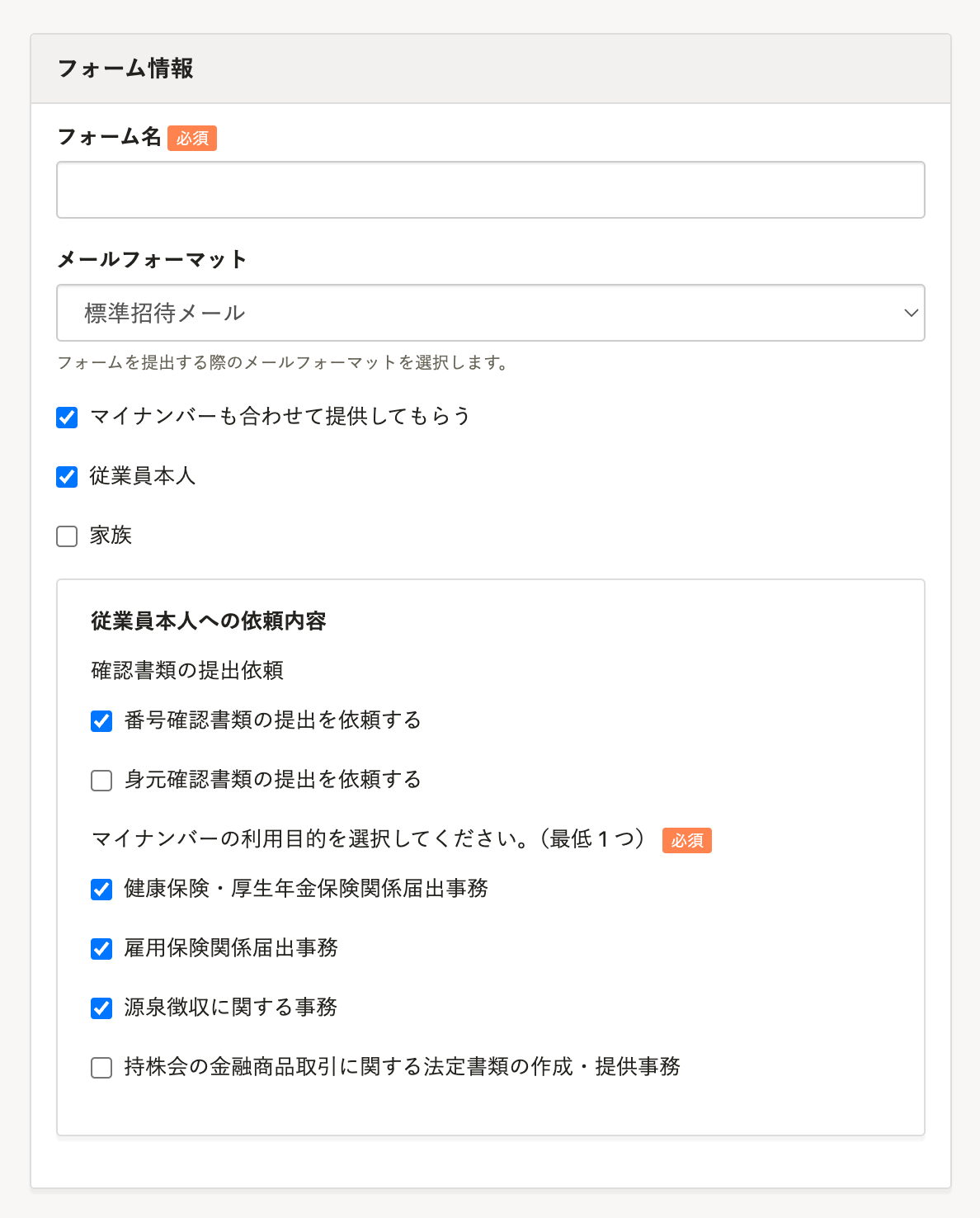- [家族]:従業員が扶養する家族のマイナンバーの提供を依頼する場合