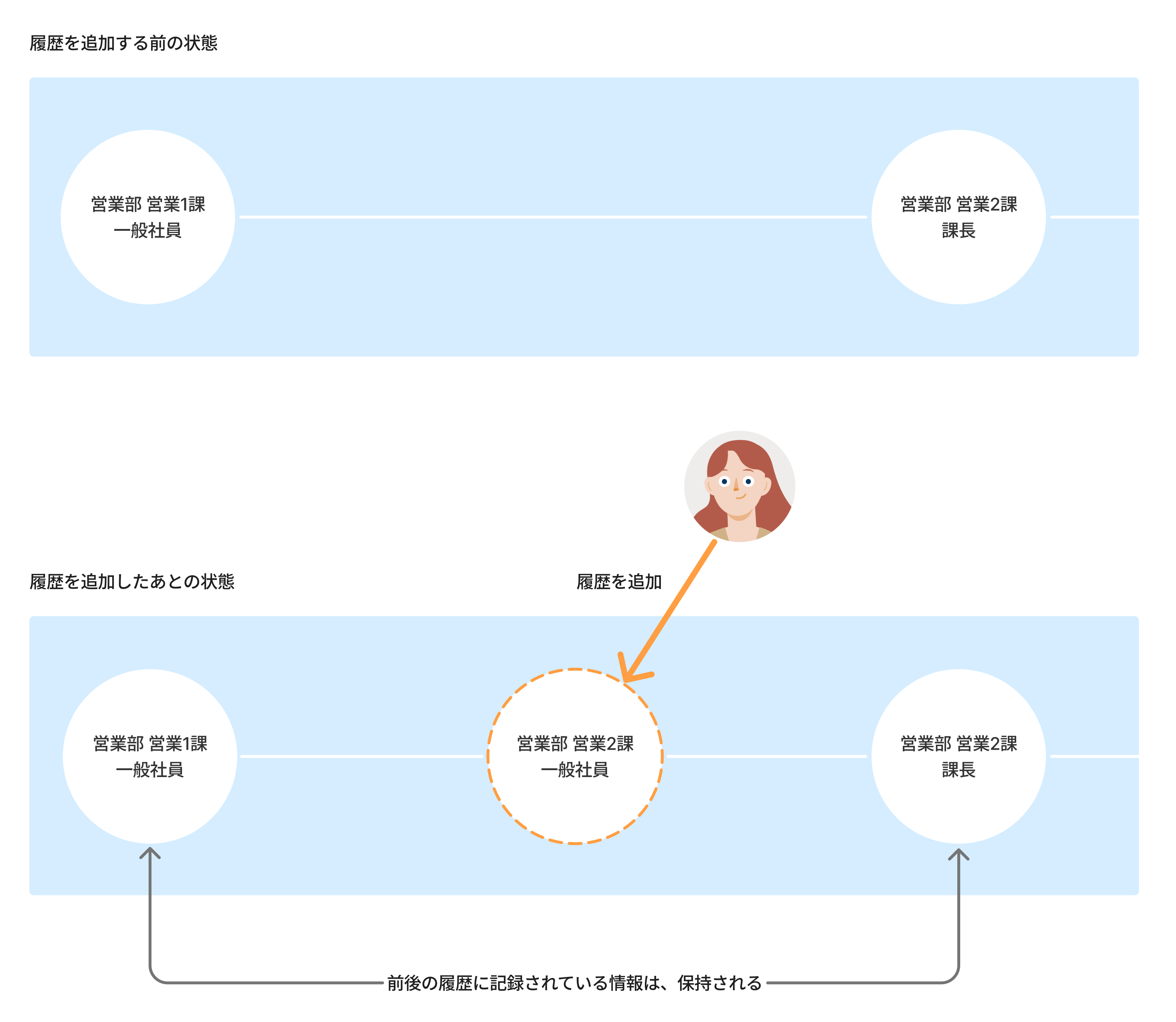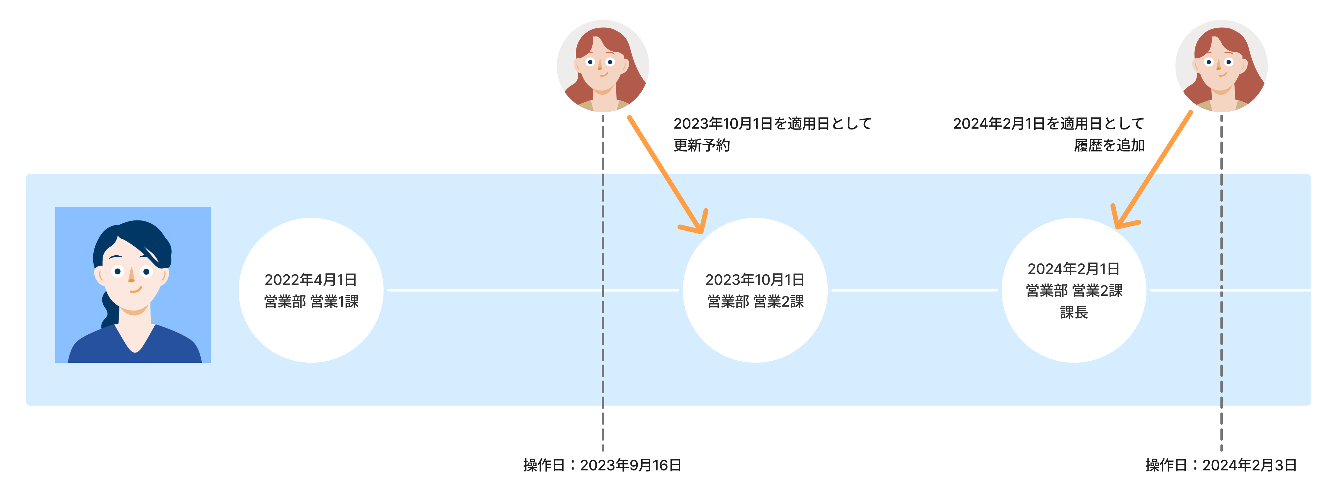 操作する日が異動日より前であれば、適用日を指定して従業員情報の更新予約をします。 異動日よりもあとであれば、適用日を指定して履歴を追加します。
