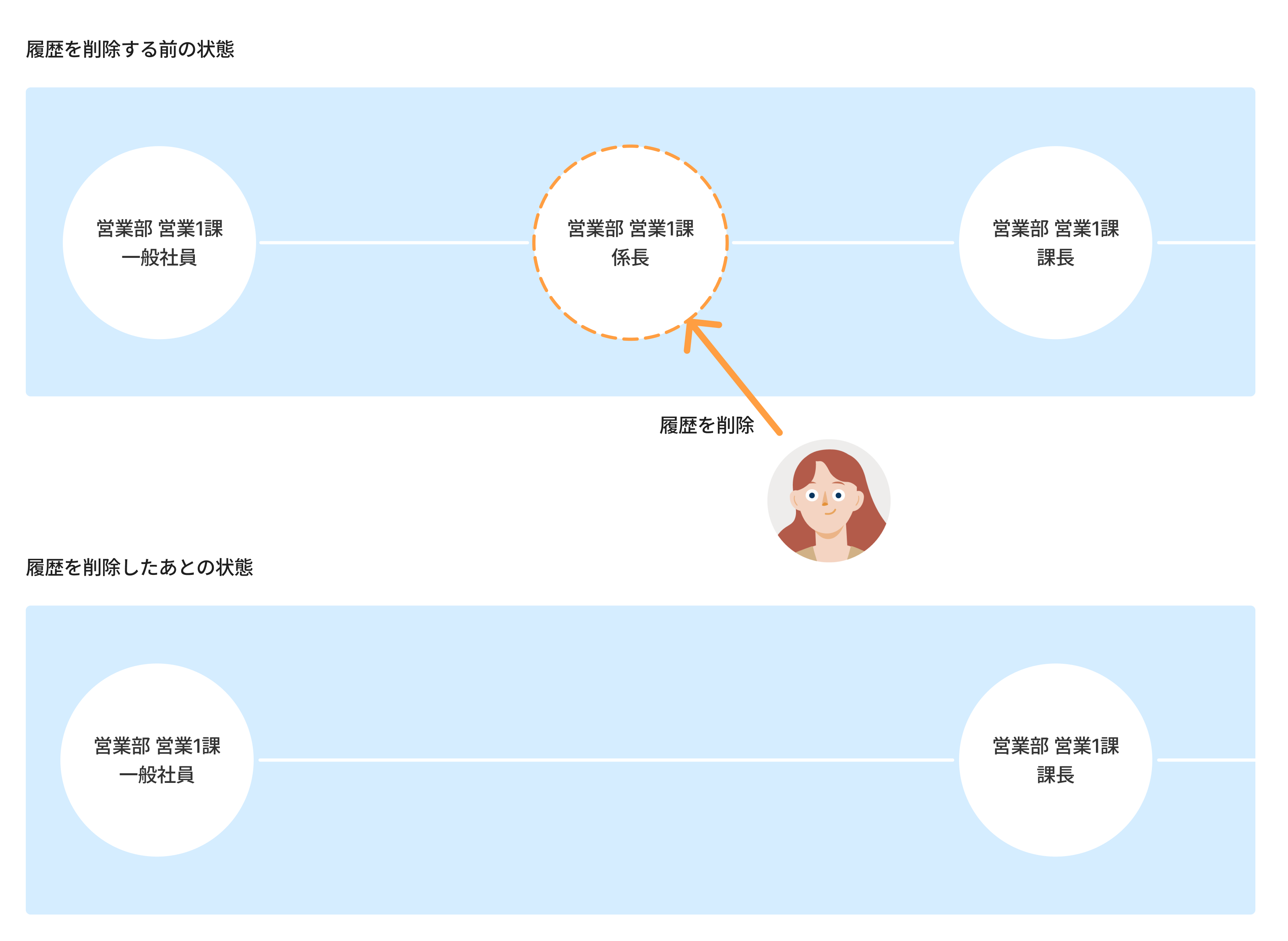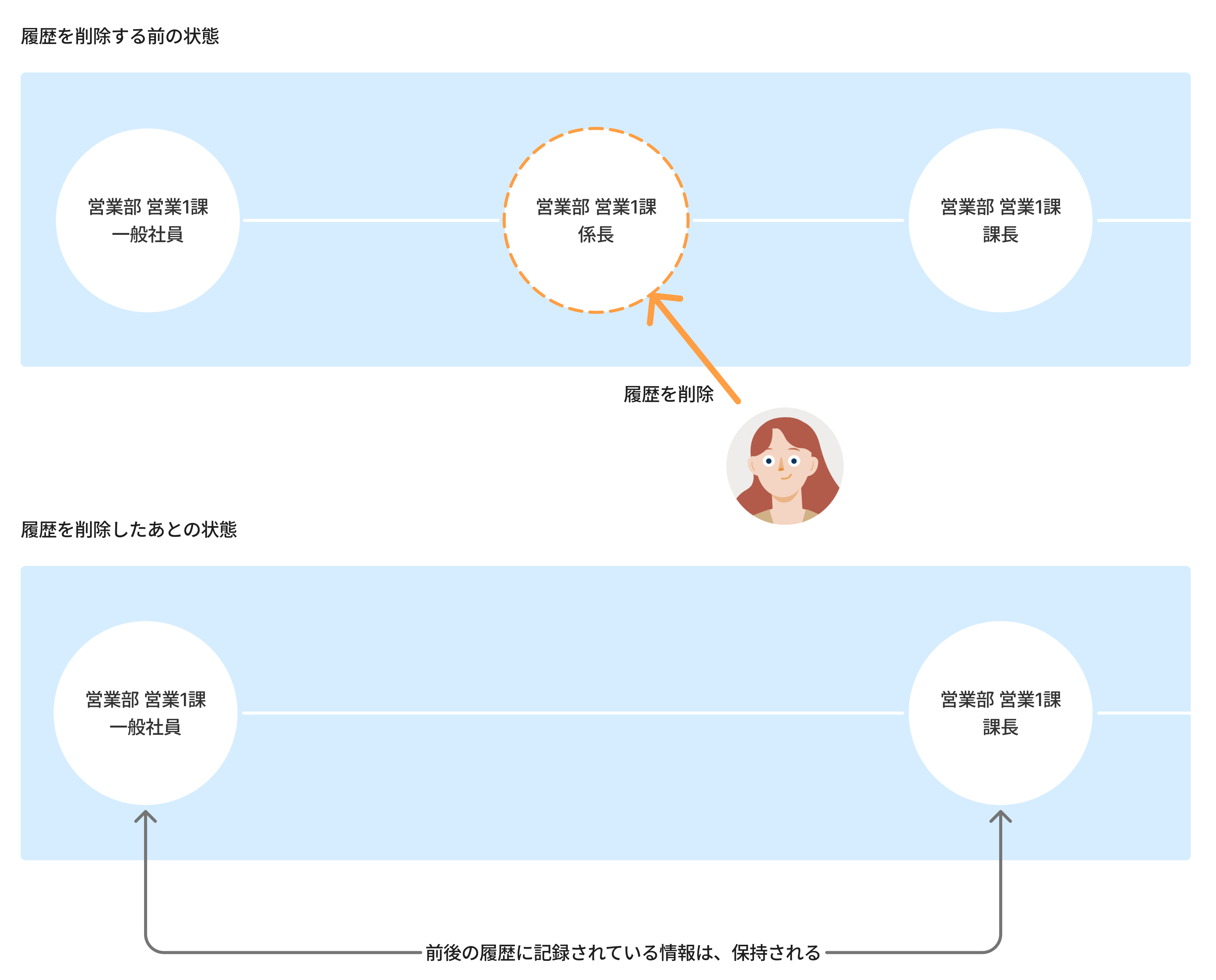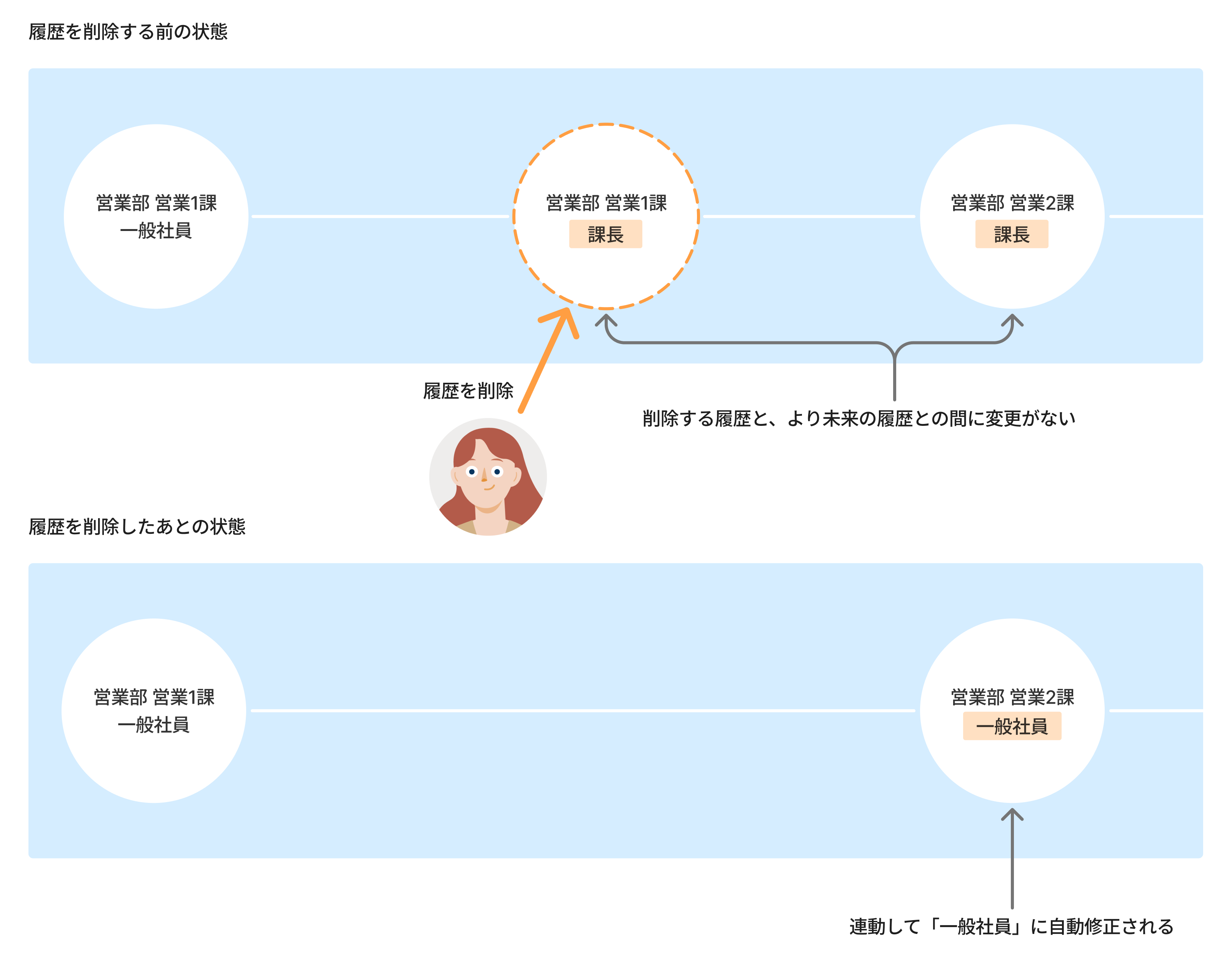 ただし、削除する履歴と、削除する履歴よりも1つ未来の履歴のあいだで変更がない項目の場合、未来の履歴も連動して自動修正されます。