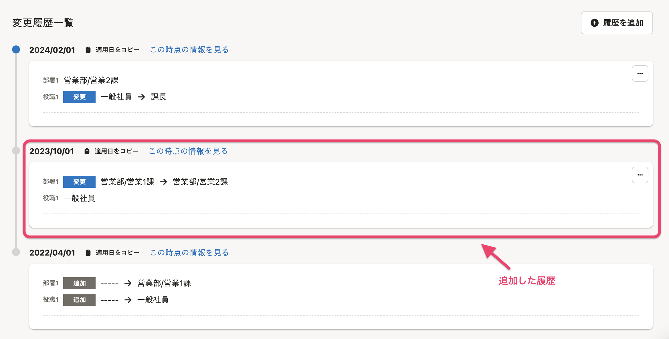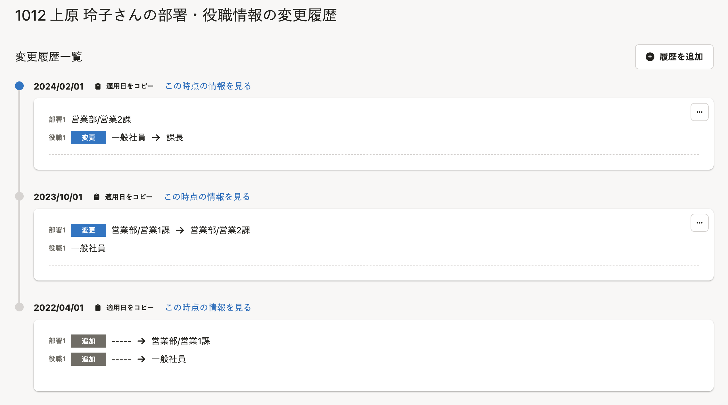 次の画像は、従業員情報の[部署・役職情報]の履歴の例です。 画像内の[追加]は当該項目に情報が新しく追加されたことを、[変更]は情報が変更されたことを意味しています。