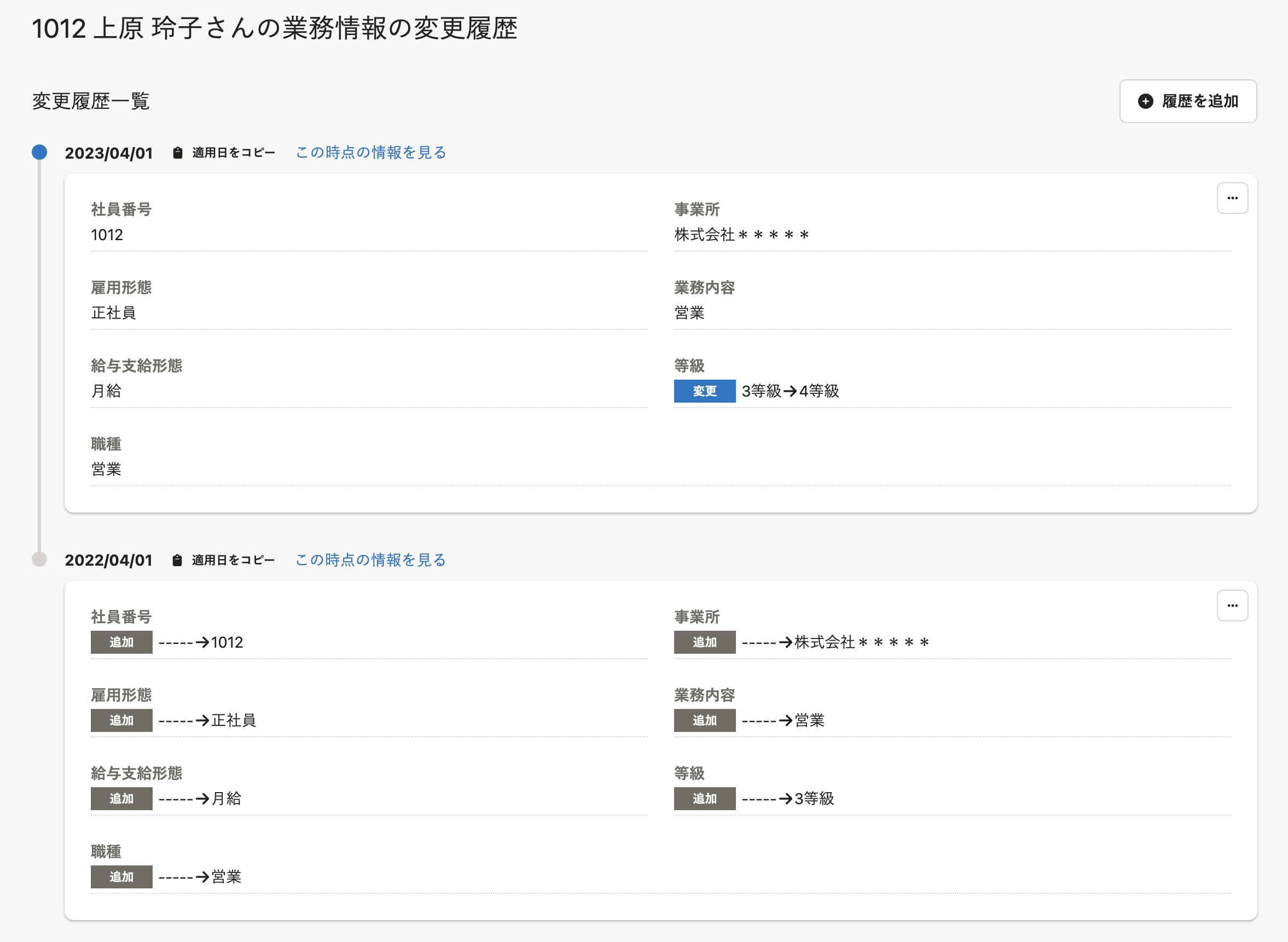 従業員情報の履歴は、従業員情報の項目グループごとに蓄積されています。 下の画像は、上の例と同じ従業員の[業務情報]の履歴です。[部署・役職情報]とは異なる適用日で[等級]の変更が記録されていることがわかります。