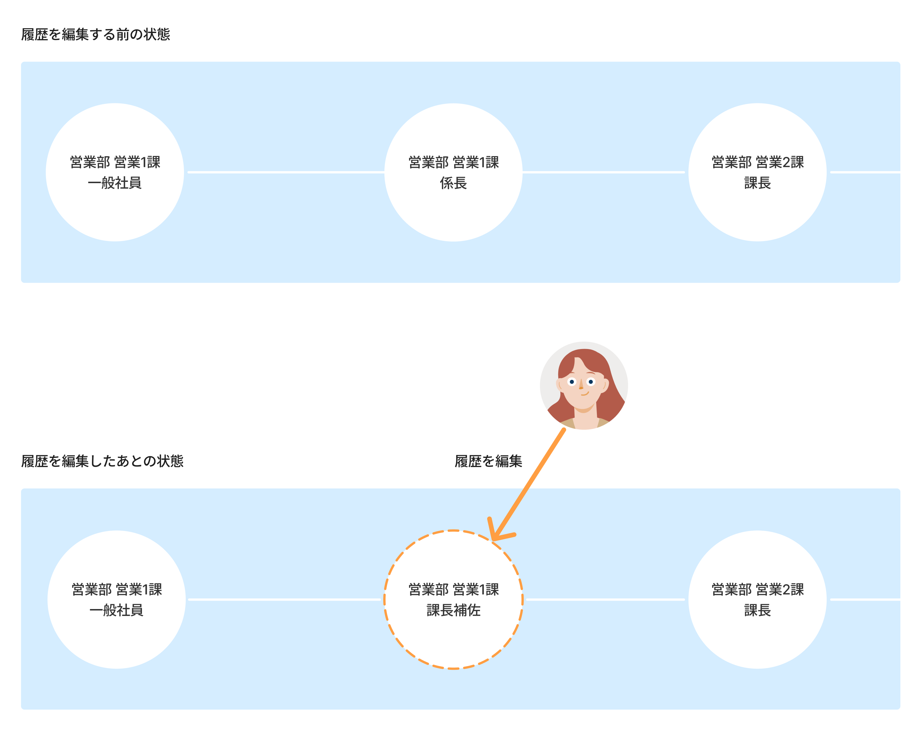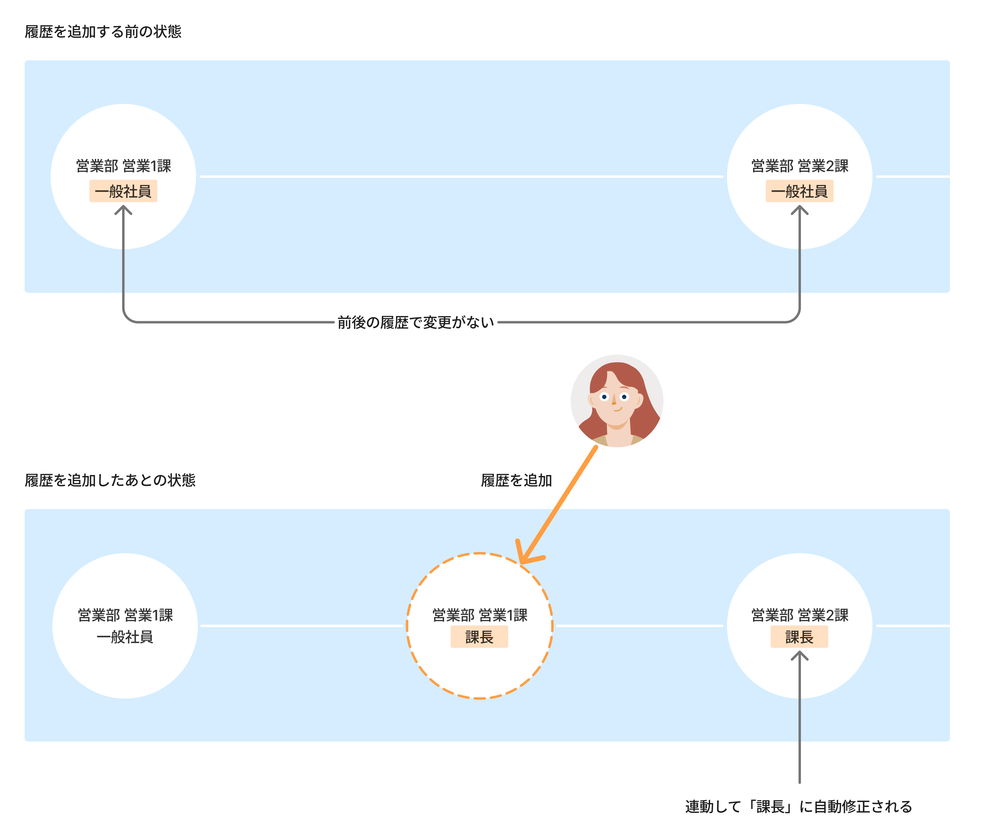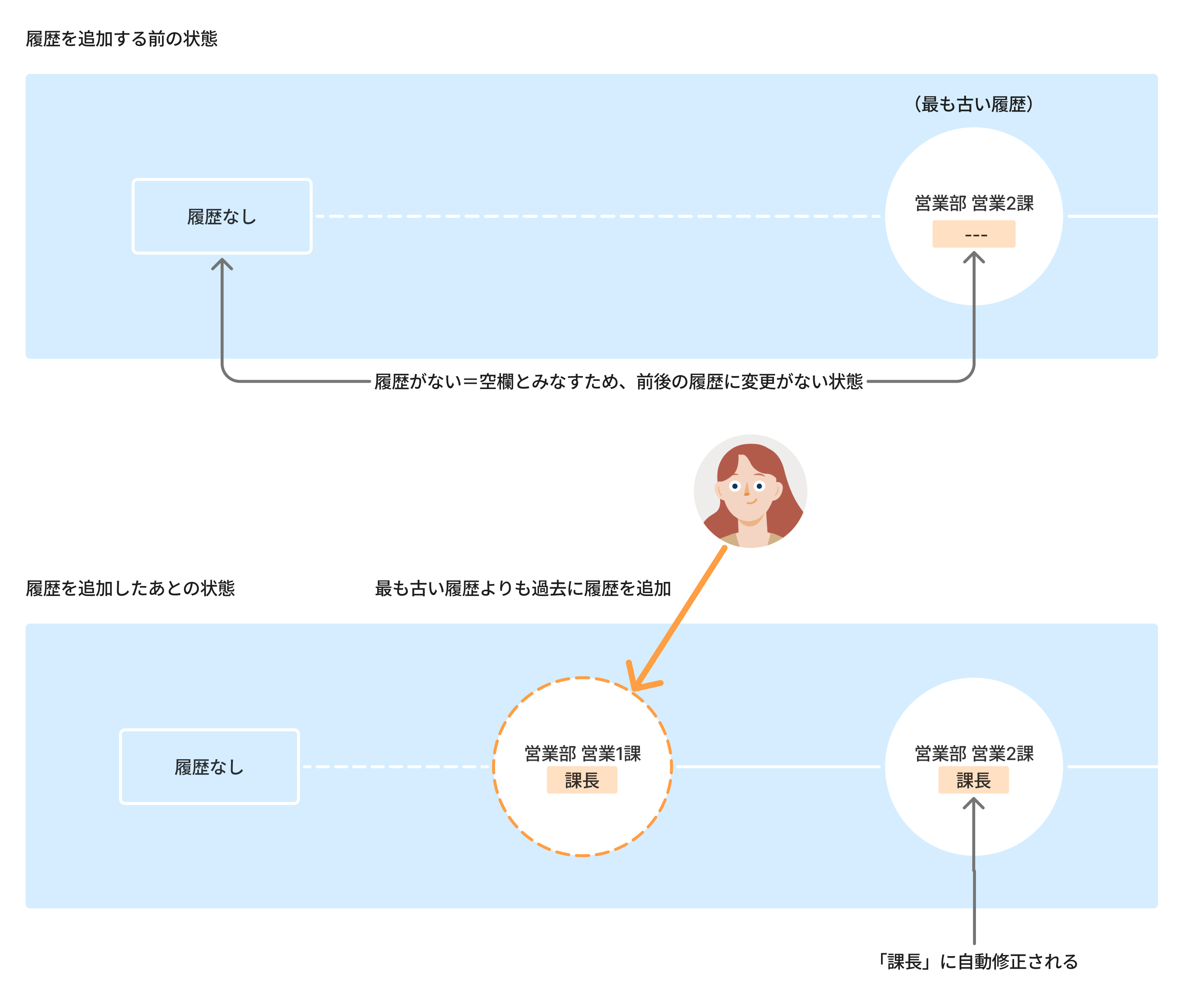 ただし、前後の履歴で変更がない項目に、新しく追加する履歴で変更を入れる場合、新しい履歴よりも未来の履歴が自動修正されます。