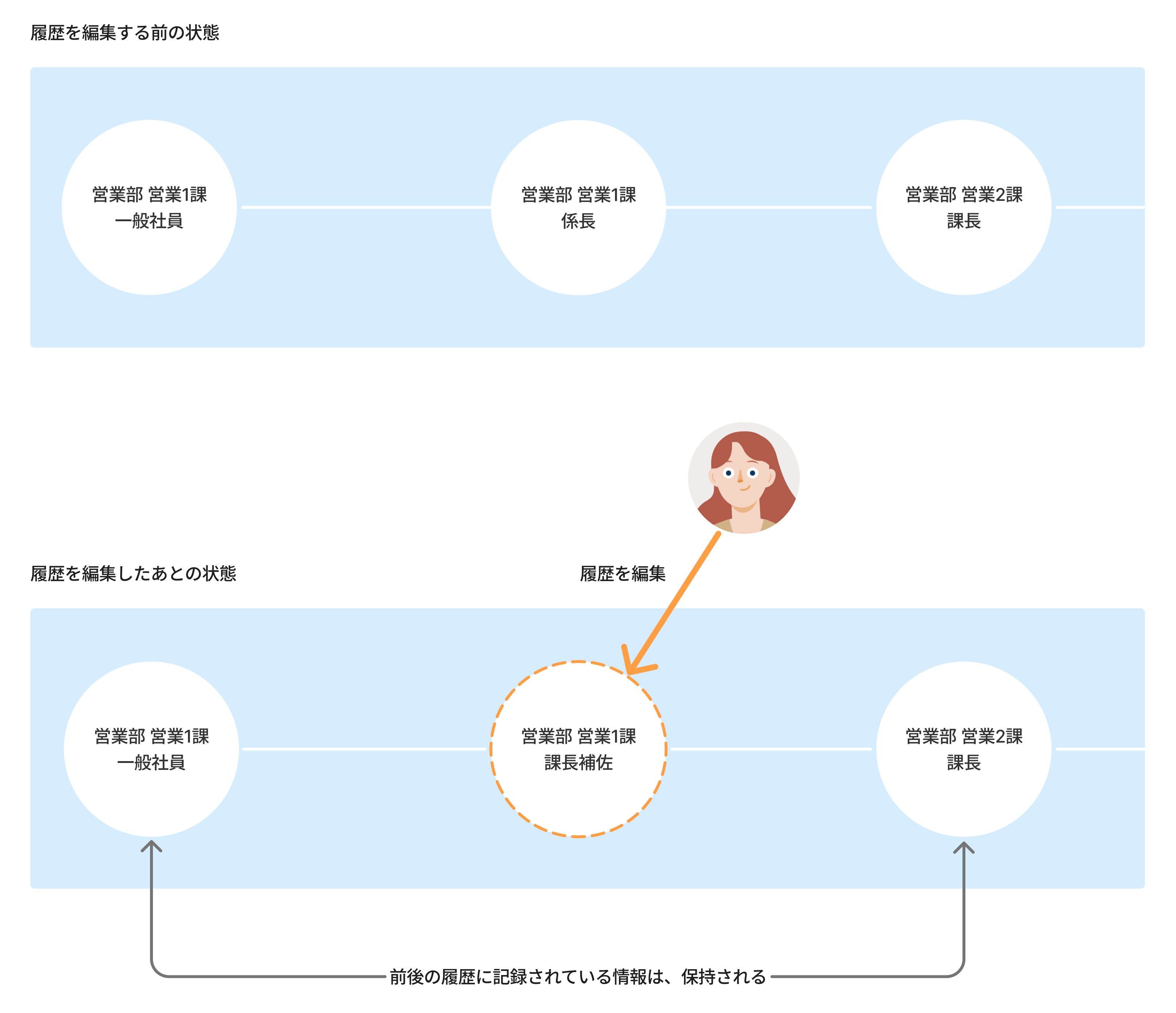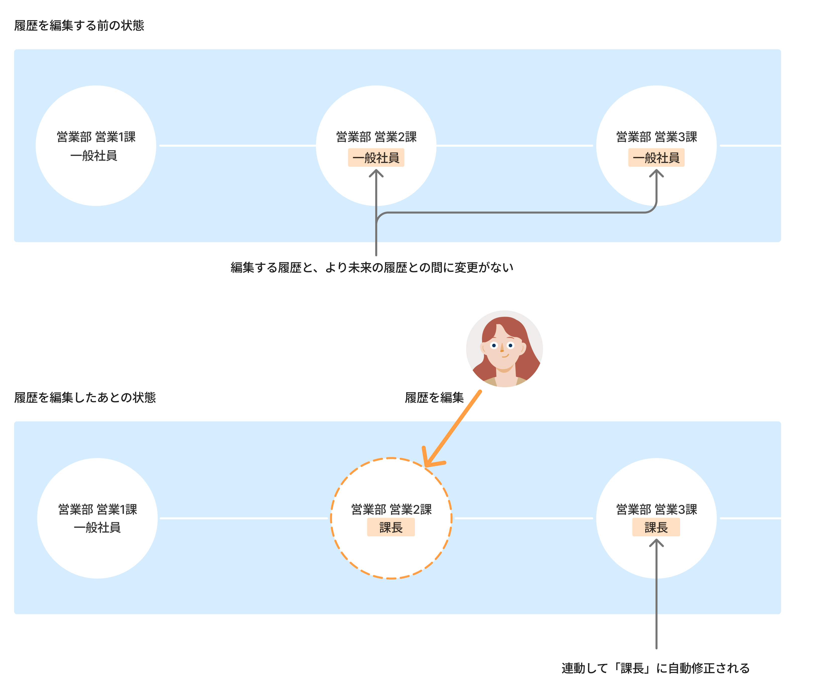 ただし、編集する履歴と、より未来の履歴との間に変更のない項目に変更を加える場合、編集する履歴よりも未来の履歴も自動修正されます。