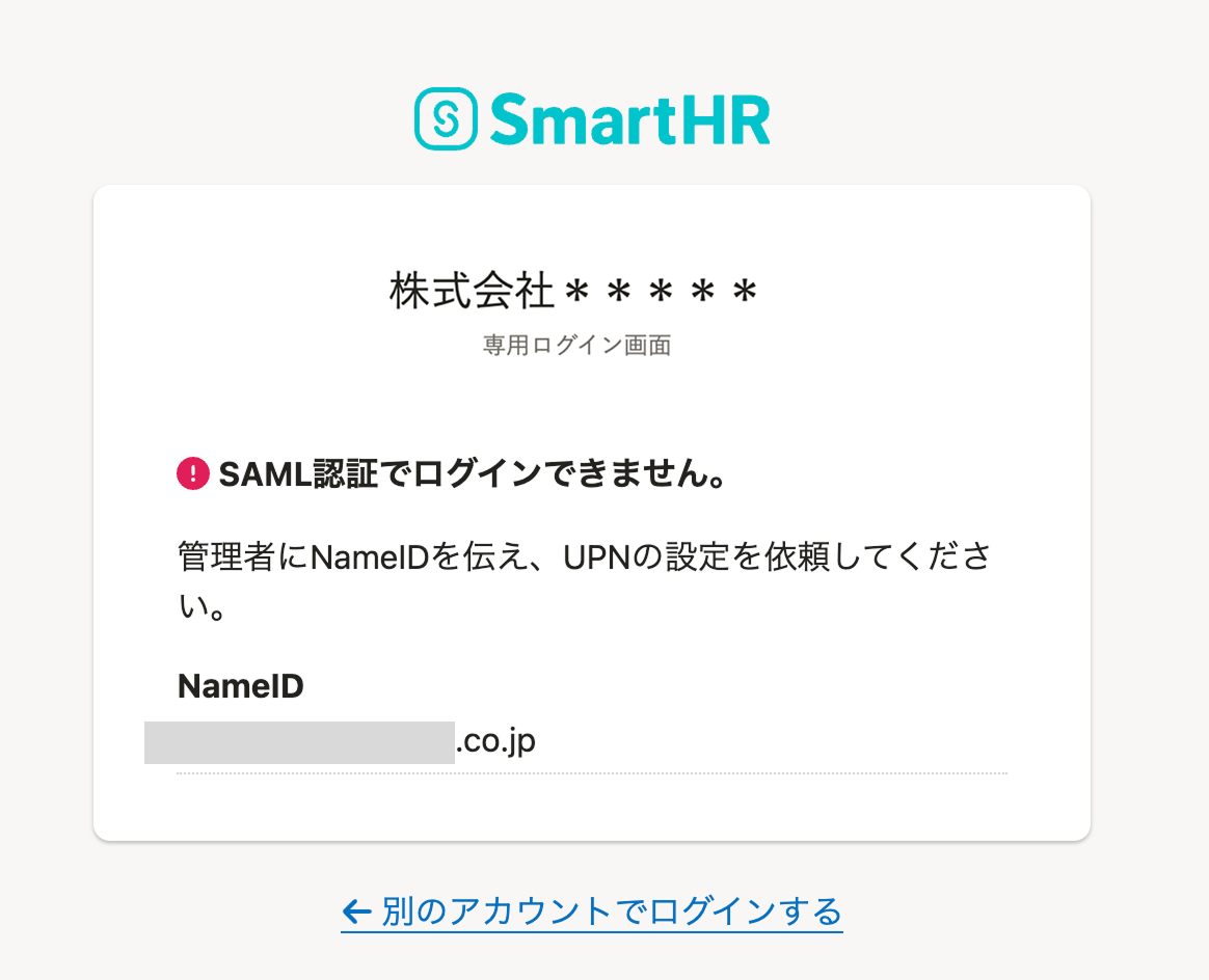 従業員の画面に「SAML認証でログインできません。管理者にNameIDを伝え、UPNの再設定を依頼してください。」のエラーメッセージが表示された場合、以下のいずれかの原因が考えられます。