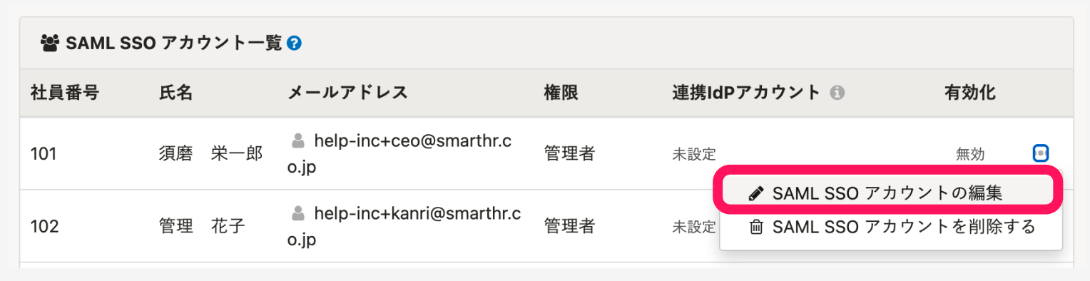 SAML SSOアカウント一覧から、SSOができない従業員の[…]>[SAML SSOアカウントの編集]を押します。