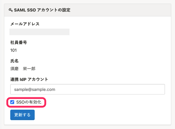 [SSOの有効化]にチェックを入れ、[更新する]を押します。