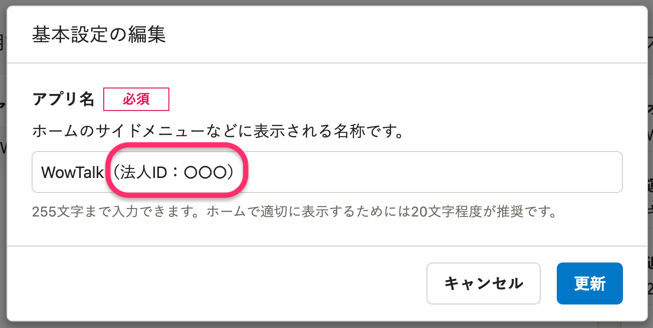 法人IDは手順1でWowTalkの管理画面Open in another tabに管理者アカウントでログインした際に使用した、法人IDと同じものです。