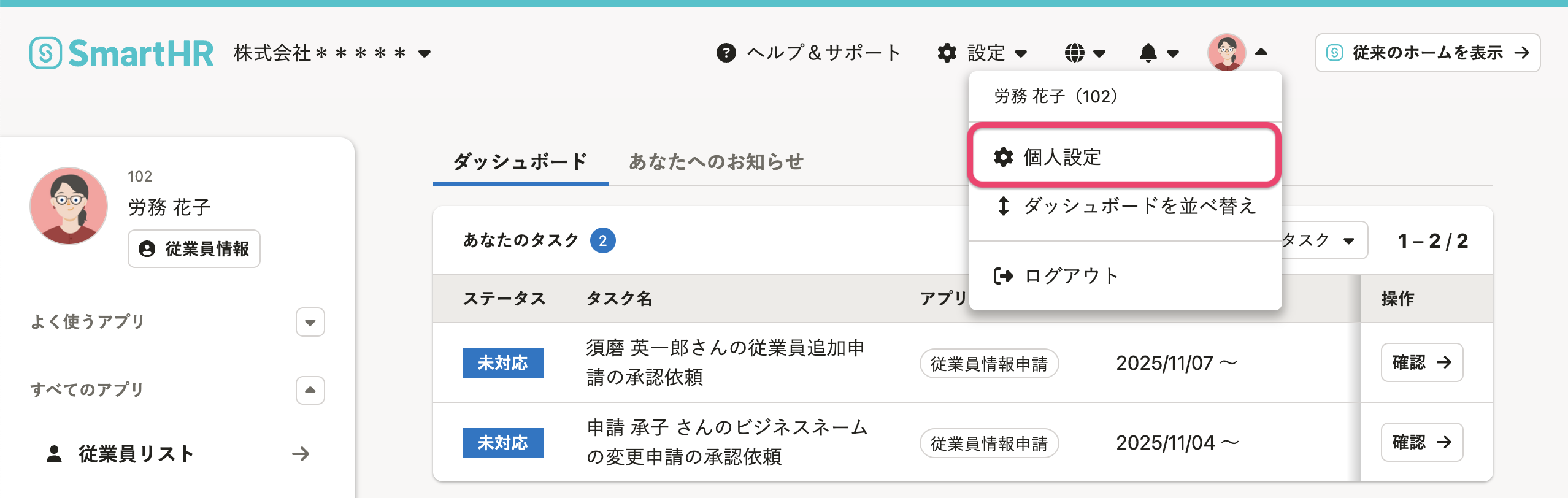 SmartHRにログインし、プロフィール画像 >[個人設定] を押します。