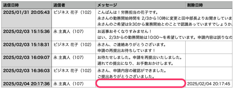 | 送信者 | 送信者のアカウントです。送信者のアカウントが従業員情報に紐づいている場合は氏名(社員番号)が、紐づいていない場合はアカウントのメールアドレスが出力されます。 | 管理 花子(1000) |