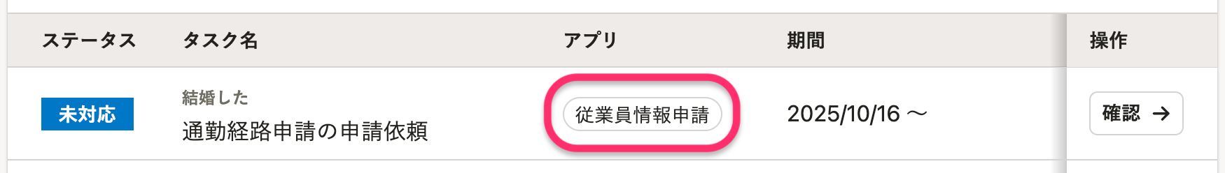 [あなたのタスク]で[アプリ]に[従業員情報申請]が表示されている場合の手順を説明します。