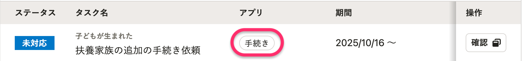 [あなたのタスク]で[アプリ]に[手続き]が表示されている場合の手順を説明します。