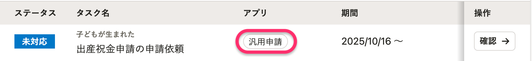 該当するタスクの[確認]を押して、申請画面に移動します。