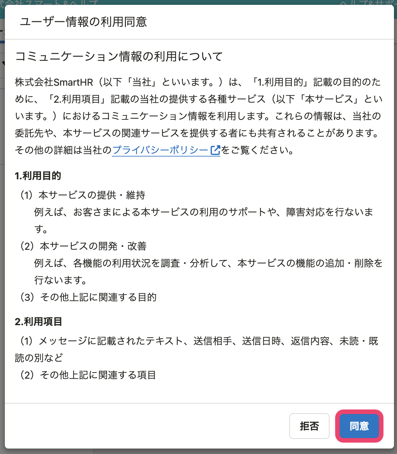はじめてメッセージ機能を使う場合、コミュニケーション情報の利用に関する同意が求められます。回答は、個人設定からいつでも変更できます。