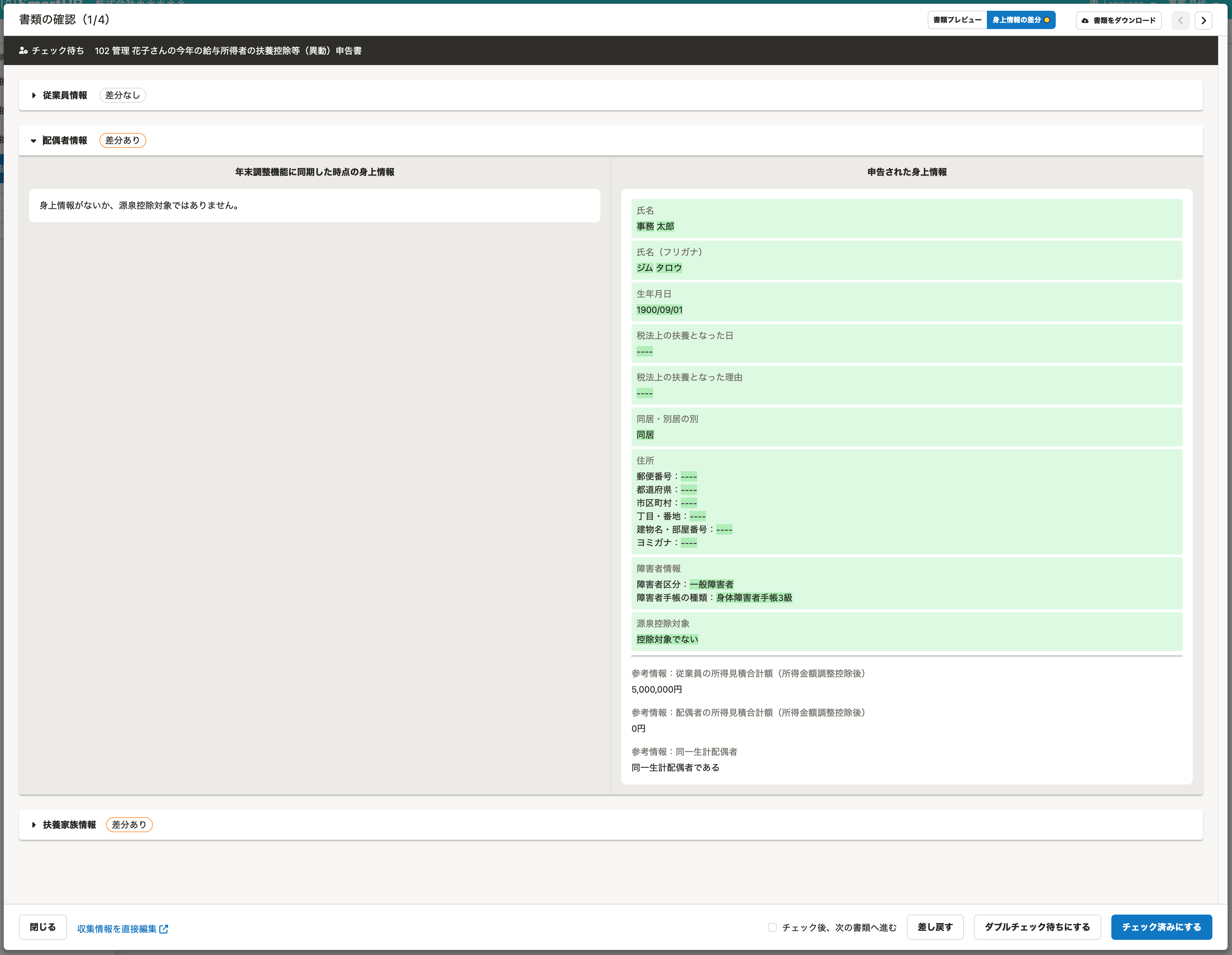 年末調整機能への配偶者の取り込まれ方と差分リストの表示