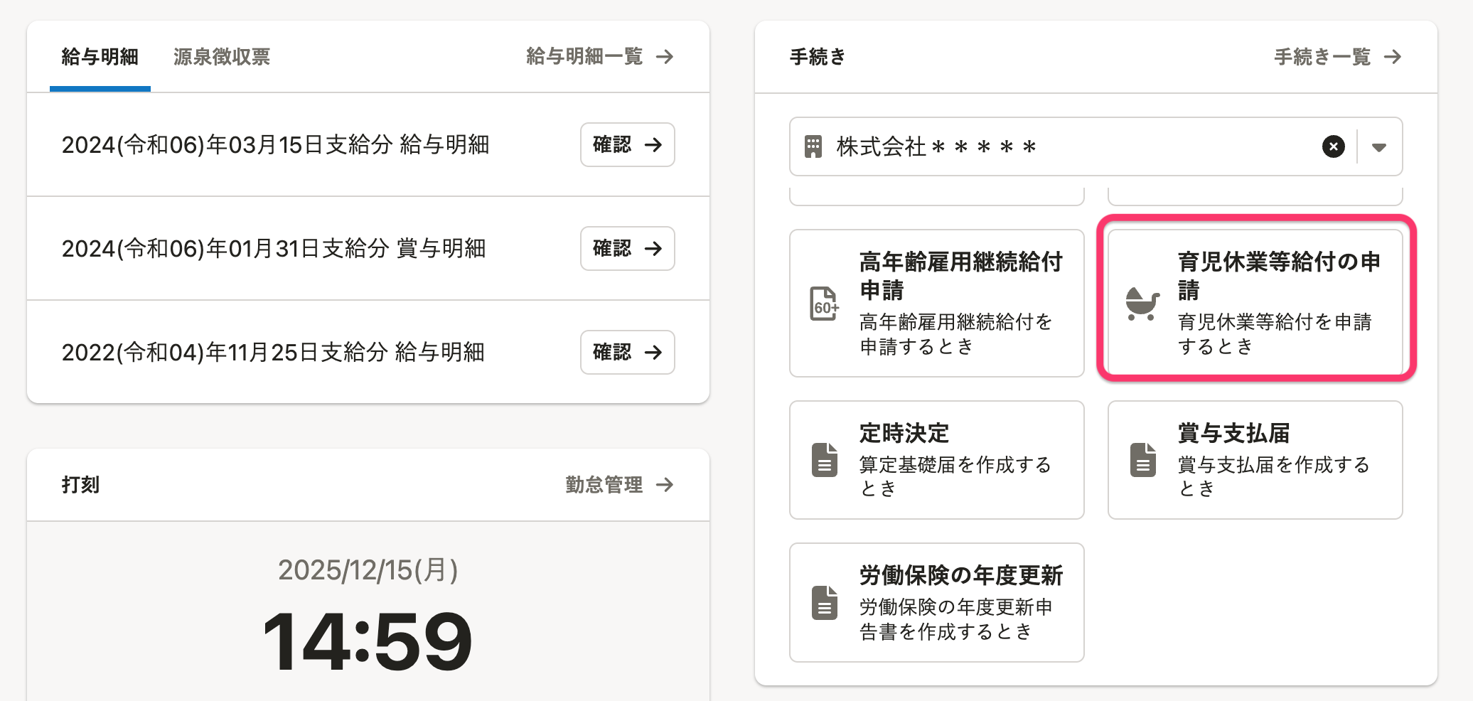 1. ホームの手続きウィジェットにある[育児休業等給付の申請]を押す