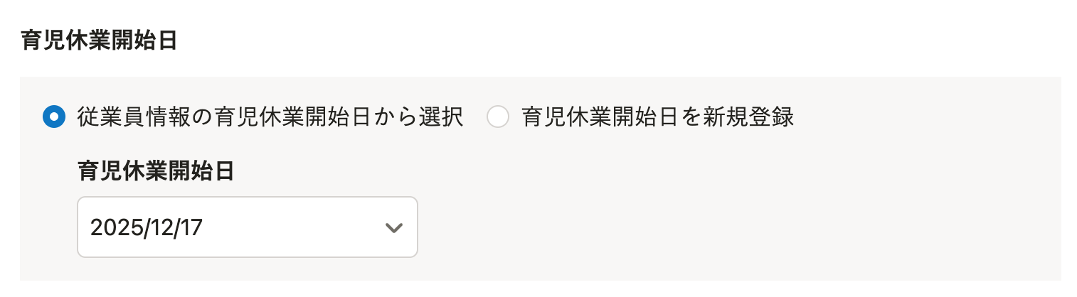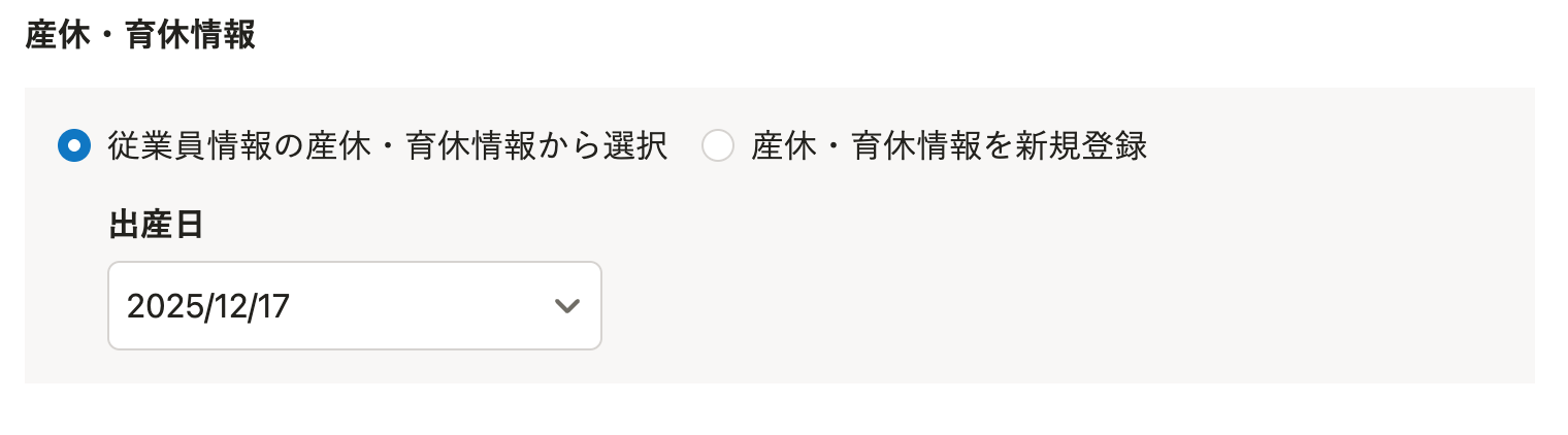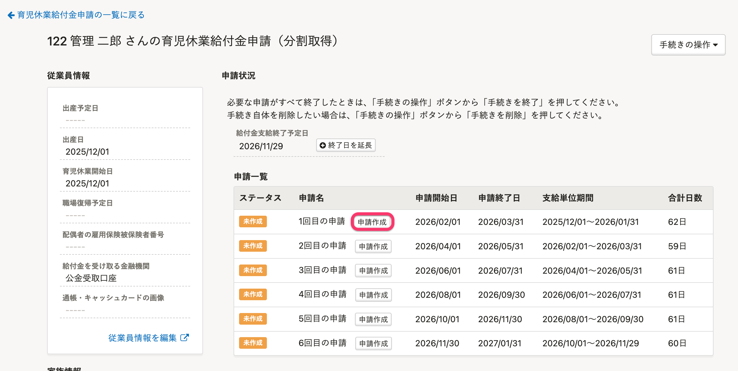 育児休業を分割せずに取得した従業員の2回目以降の申請を作成する場合は、育児休業給付金申請の作成方法を参照してください。