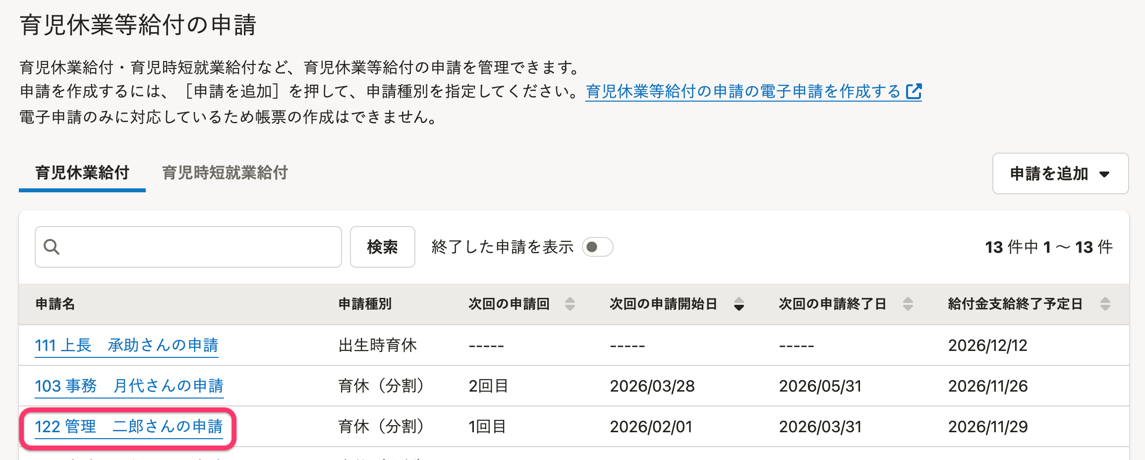 [申請を追加]を押し、[育児休業給付金(分割取得)]を選択します。対象の従業員を選択する画面が表示されます。