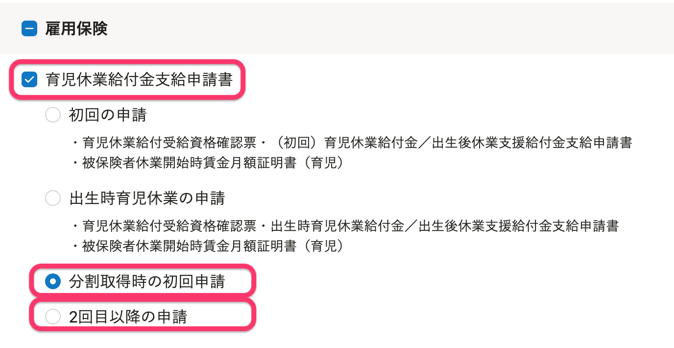 作成する書類を選択する画面では、[雇用保険]>[育児休業給付金支給申請書]にチェックを入れ、申請回数に応じて以下のいずれかを選択してください。