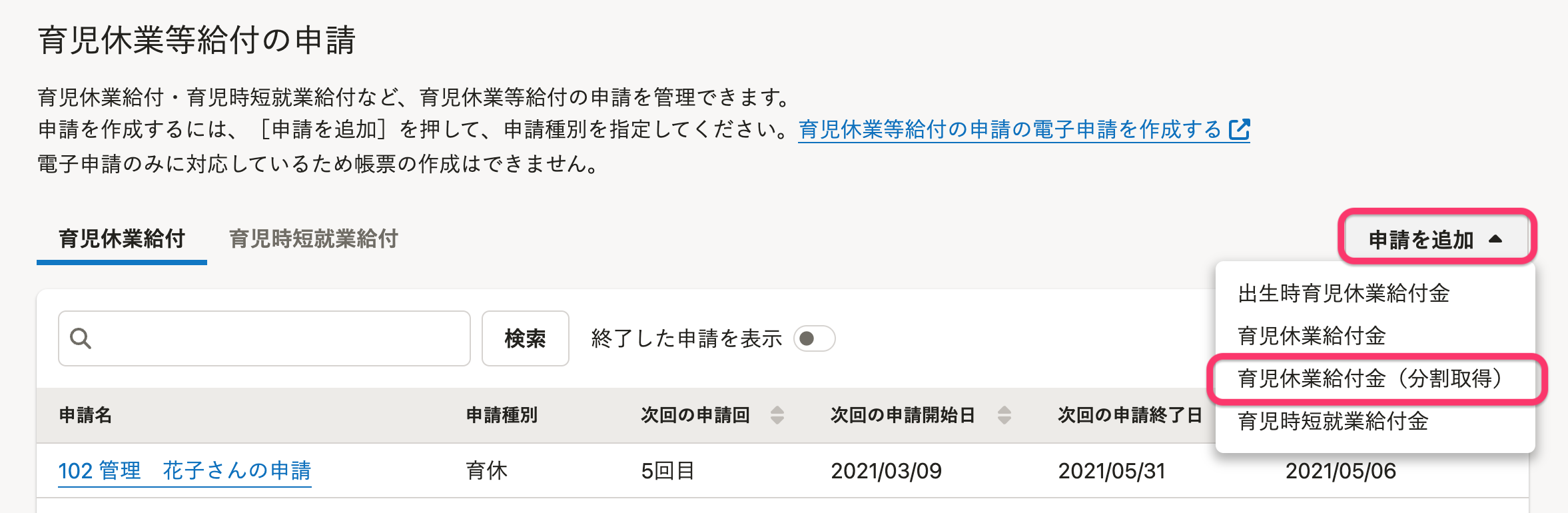 2. [申請を追加]を押し、[育児休業給付金(分割取得)]を選択