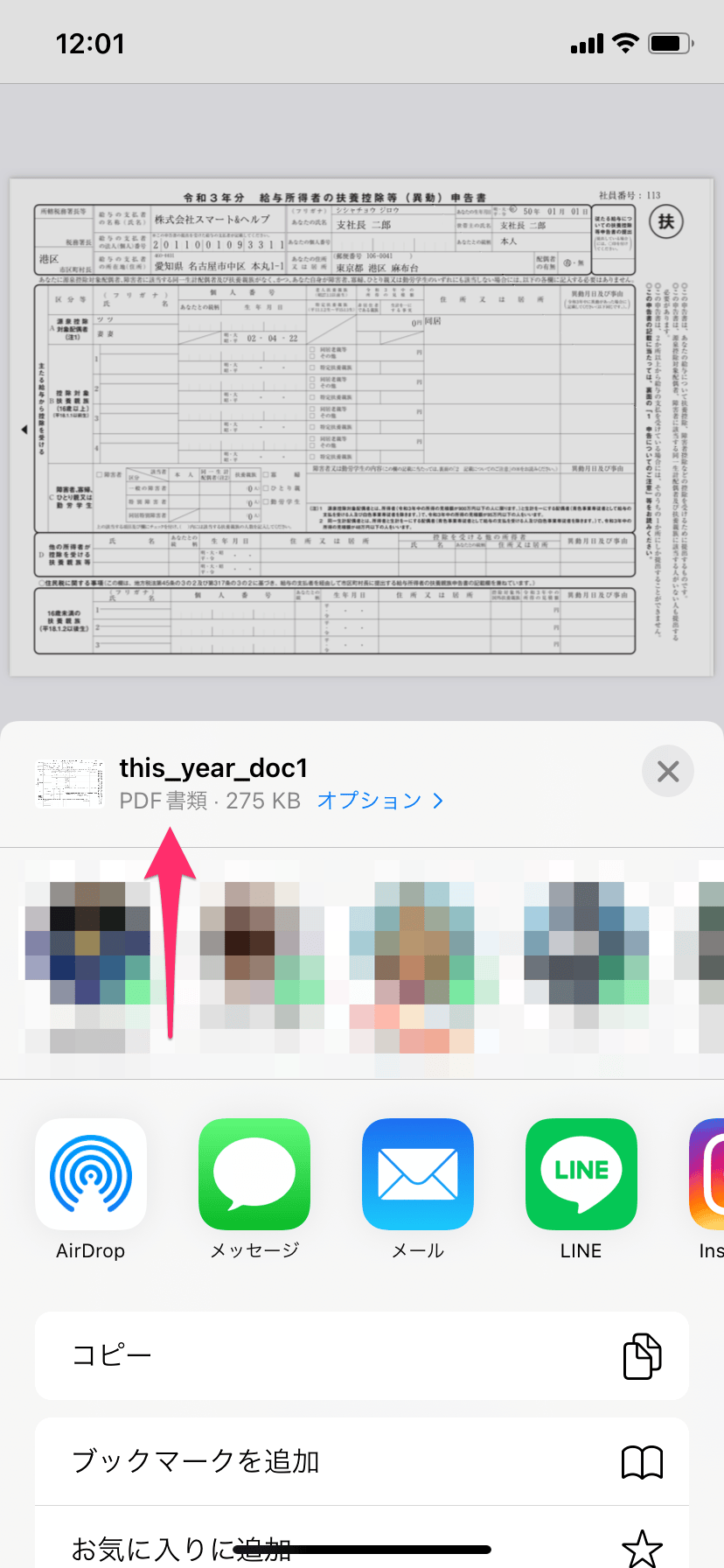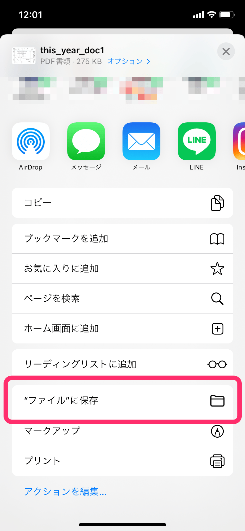 保存したいPDF書類のプレビュー画面下部にある、矢印のアイコンを押します。