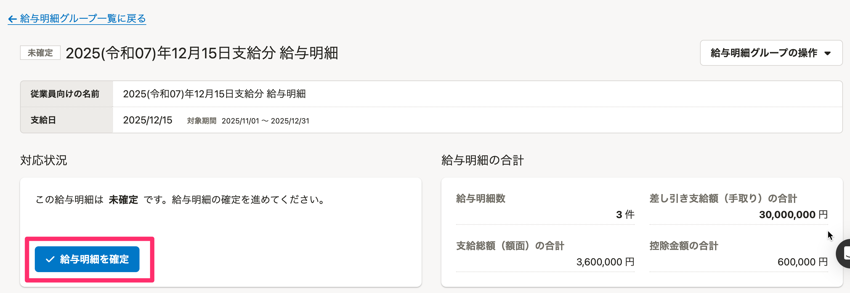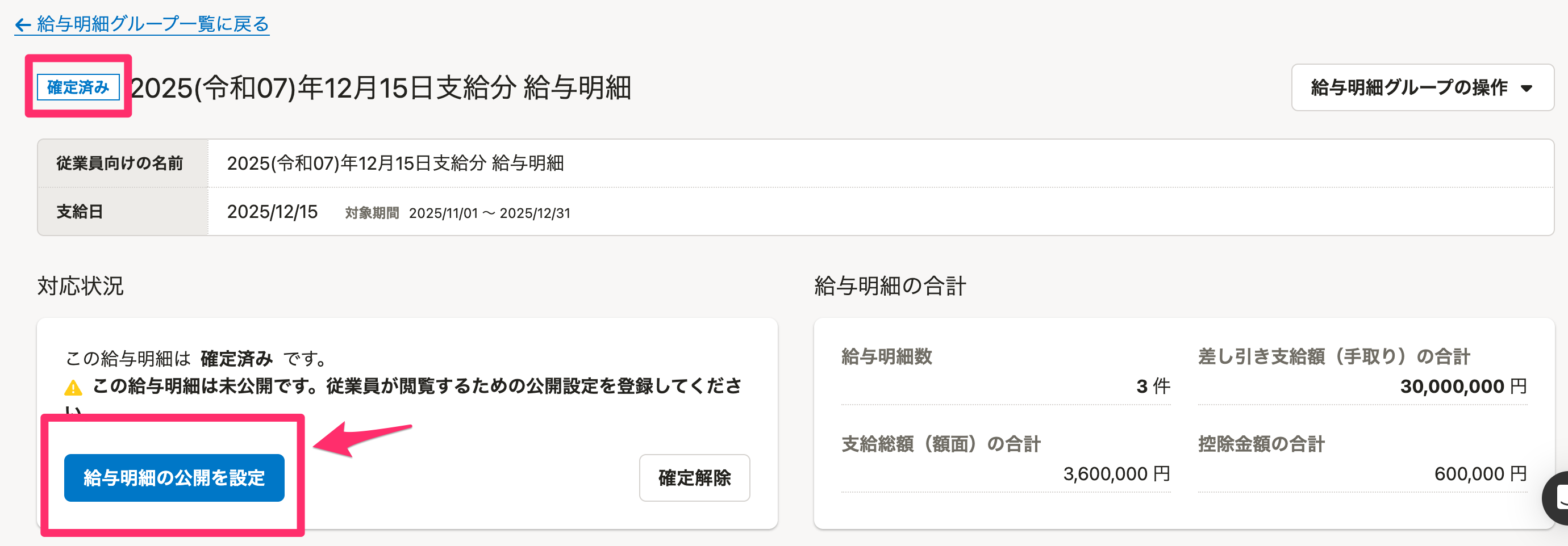 給与明細グループの詳細画面の[対応状況]の欄にある[給与明細を確定]を押すと、ステータスが[確定済み]に変わります。