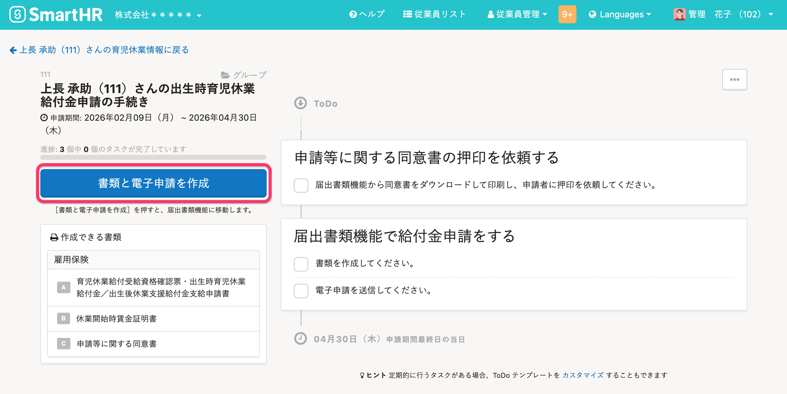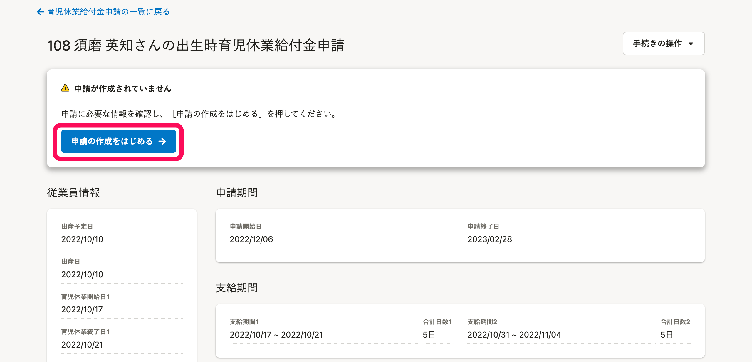 出生時育児休業給付金申請の画面で[申請の作成をはじめる]を押します。手続きToDo画面が表示されます。