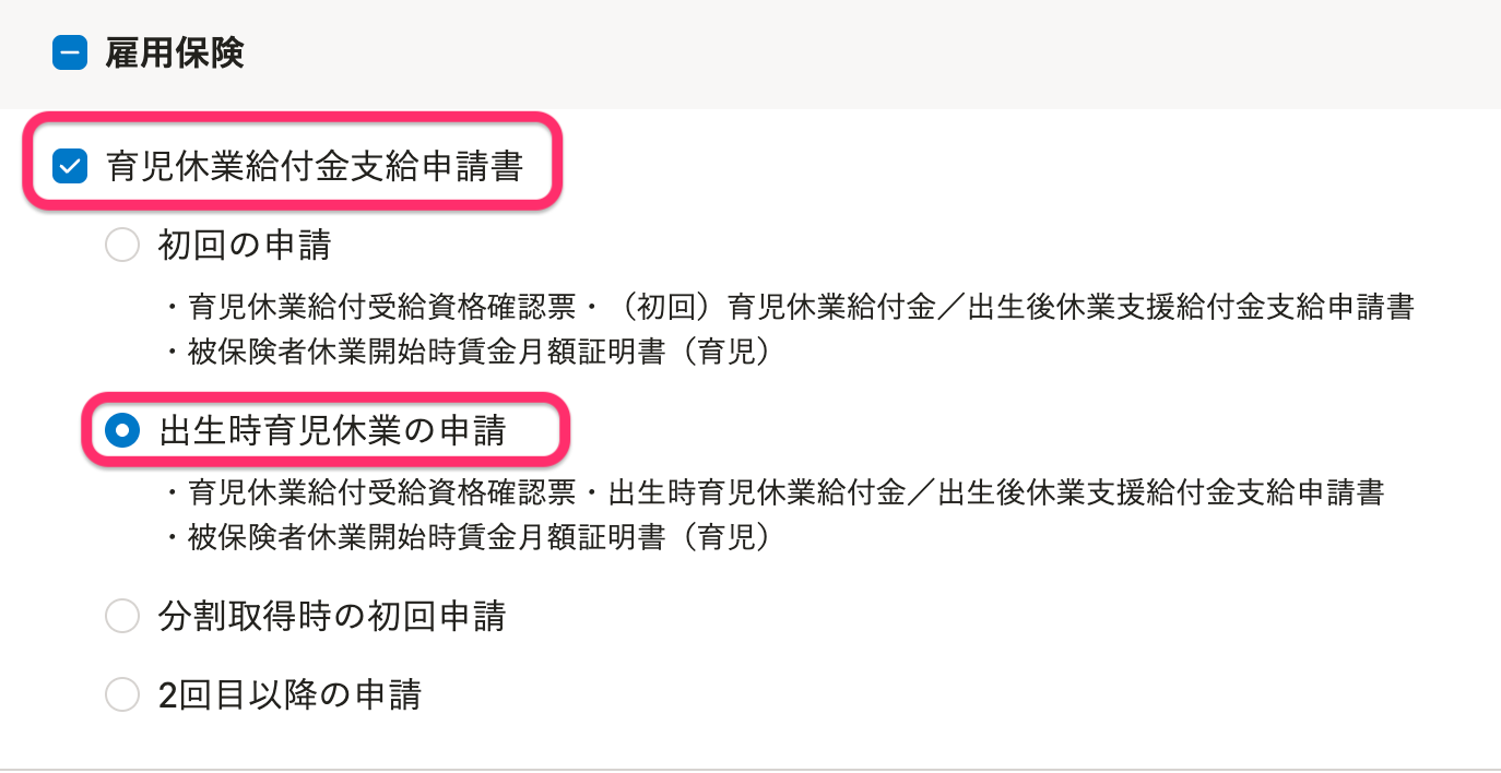 作成する書類を選択する画面では、[雇用保険]>[育児休業給付金支給申請書]にチェックを入れ、[出生時育児休業の申請]を選択してください。