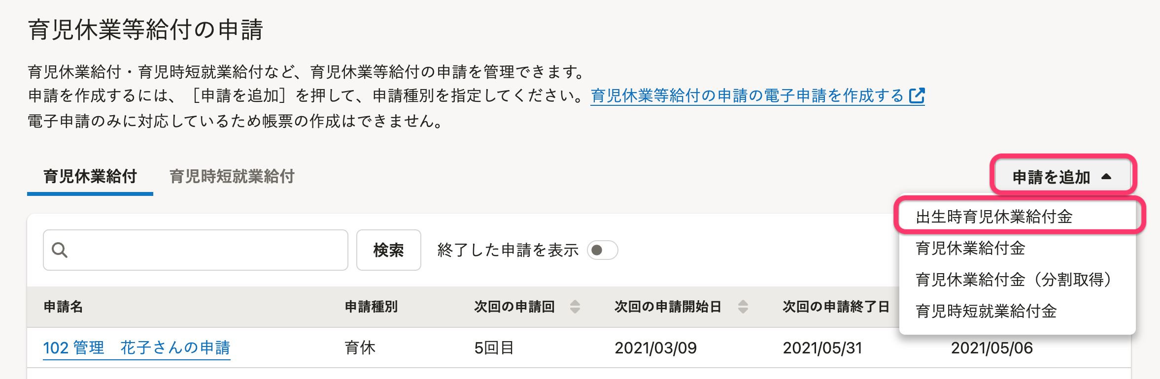 2. [申請を追加]を押し、[出生時育児休業給付金]を選択