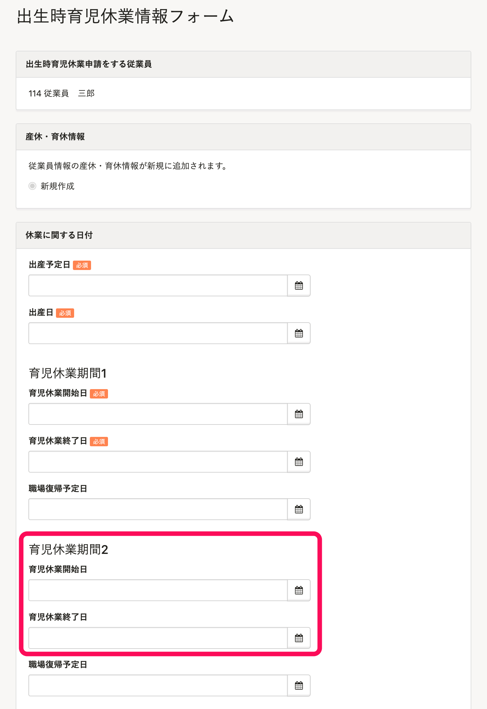 [育児休業期間2]に2回目の[育児休業開始日]、[育児休業終了日]を入力してください。