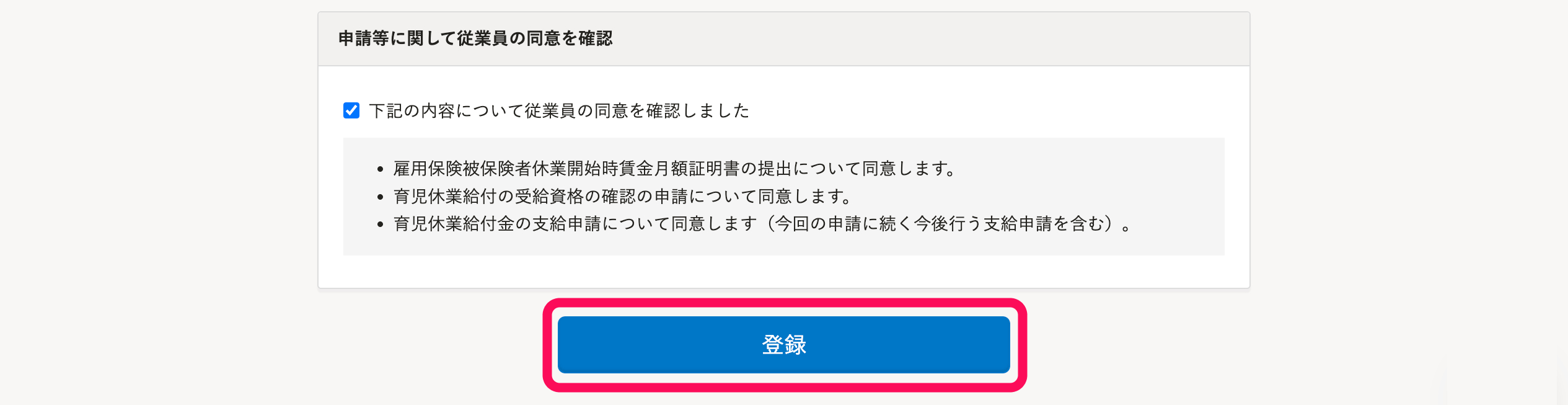 記載内容について従業員から同意を得た上で、[下記の内容について従業員の同意を確認しました]にチェックを入れます。