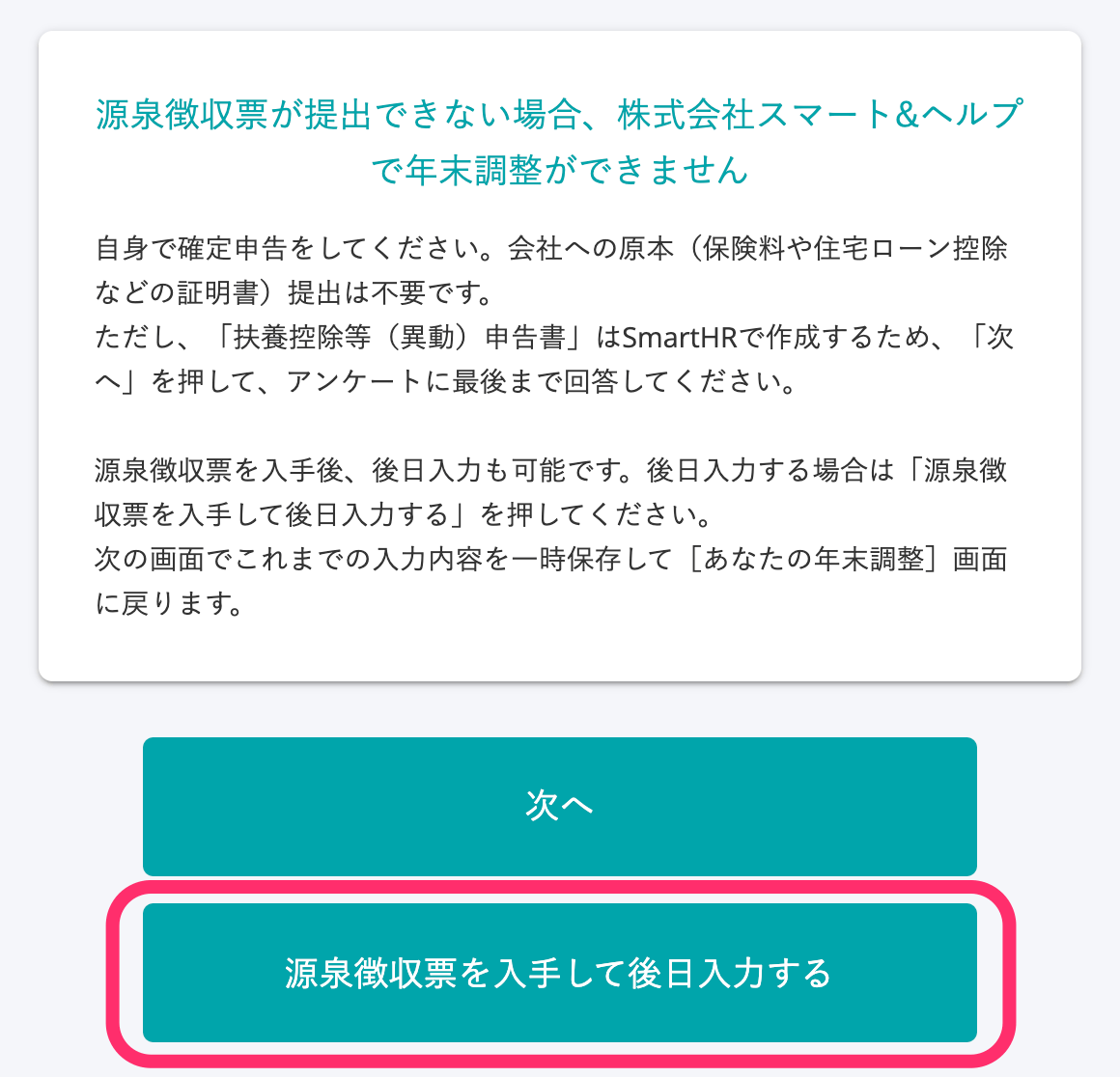 [源泉徴収票を入手して後日入力する]を選択して入力を中断した場合