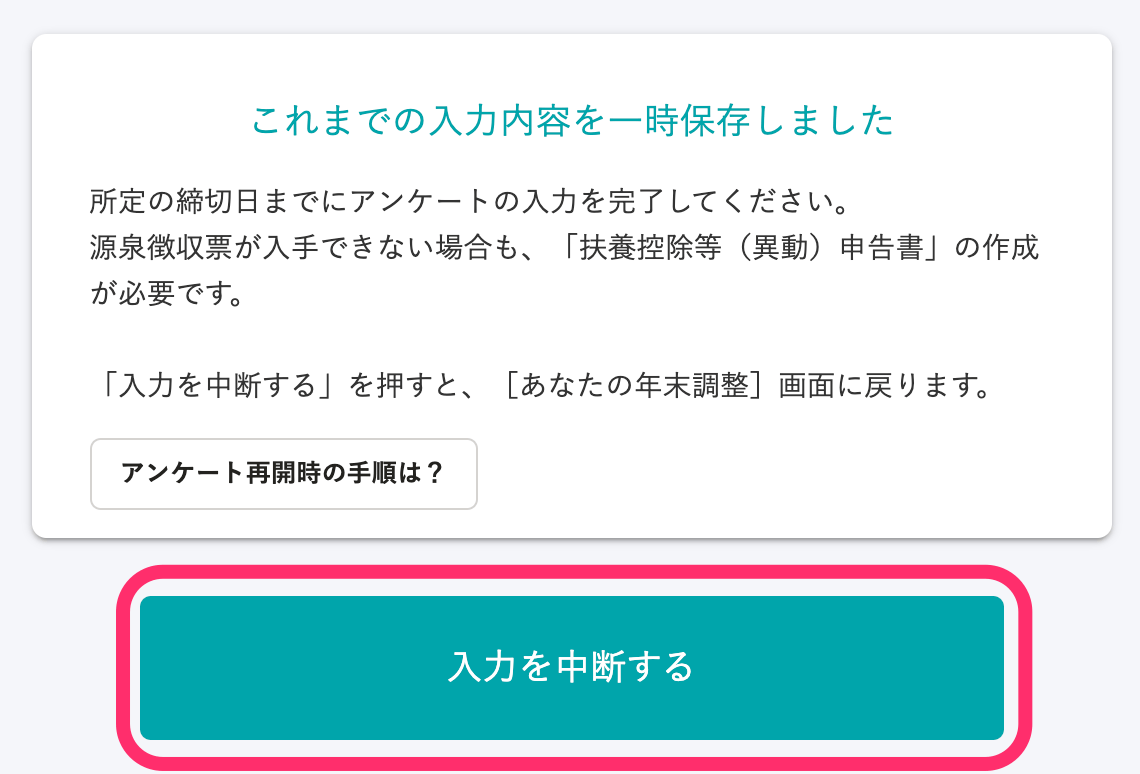 中断するにあたって必要な操作は特にありません。 アンケートの入力内容は画面ごとに保存されます。