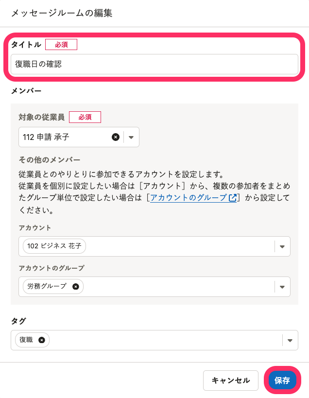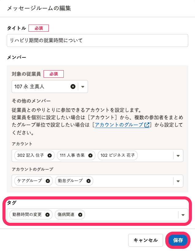 [タグ]の選択肢に目的のタグがない場合は、メッセージルームをタグで管理するを参照して、新しいタグを追加してください。