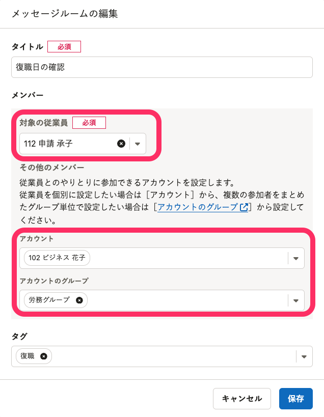 [対象の従業員]から、削除したいアカウントの[×]を押し、ドロップダウンリストで対象のアカウントを選び直します。 新たに「対象の従業員」に設定されたアカウントは、それまでのメッセージのやりとりを閲覧できるようになります。