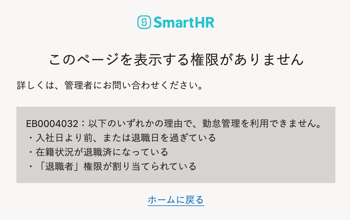 退職日の翌日以降、該当の従業員は勤怠管理を利用できなくなります。該当の従業員が勤怠管理にアクセスしようとすると、「このページを表示する権限がありません」という画面が表示されます。 画像を表示する