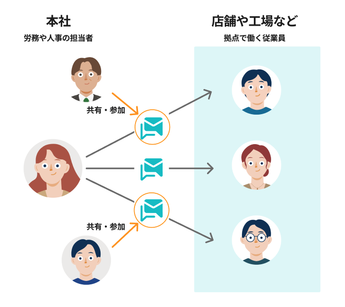メッセージのやりとりは担当者からしか開始できないため、従業員から無数の問い合わせや連絡がくるといった事態を避けられます。
