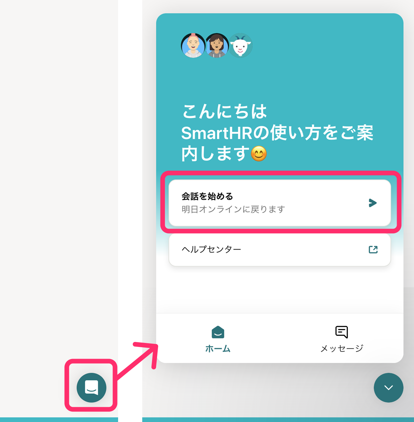 有人チャットを利用できない方は、貴社のSmartHRの管理者の方にお問い合わせください。