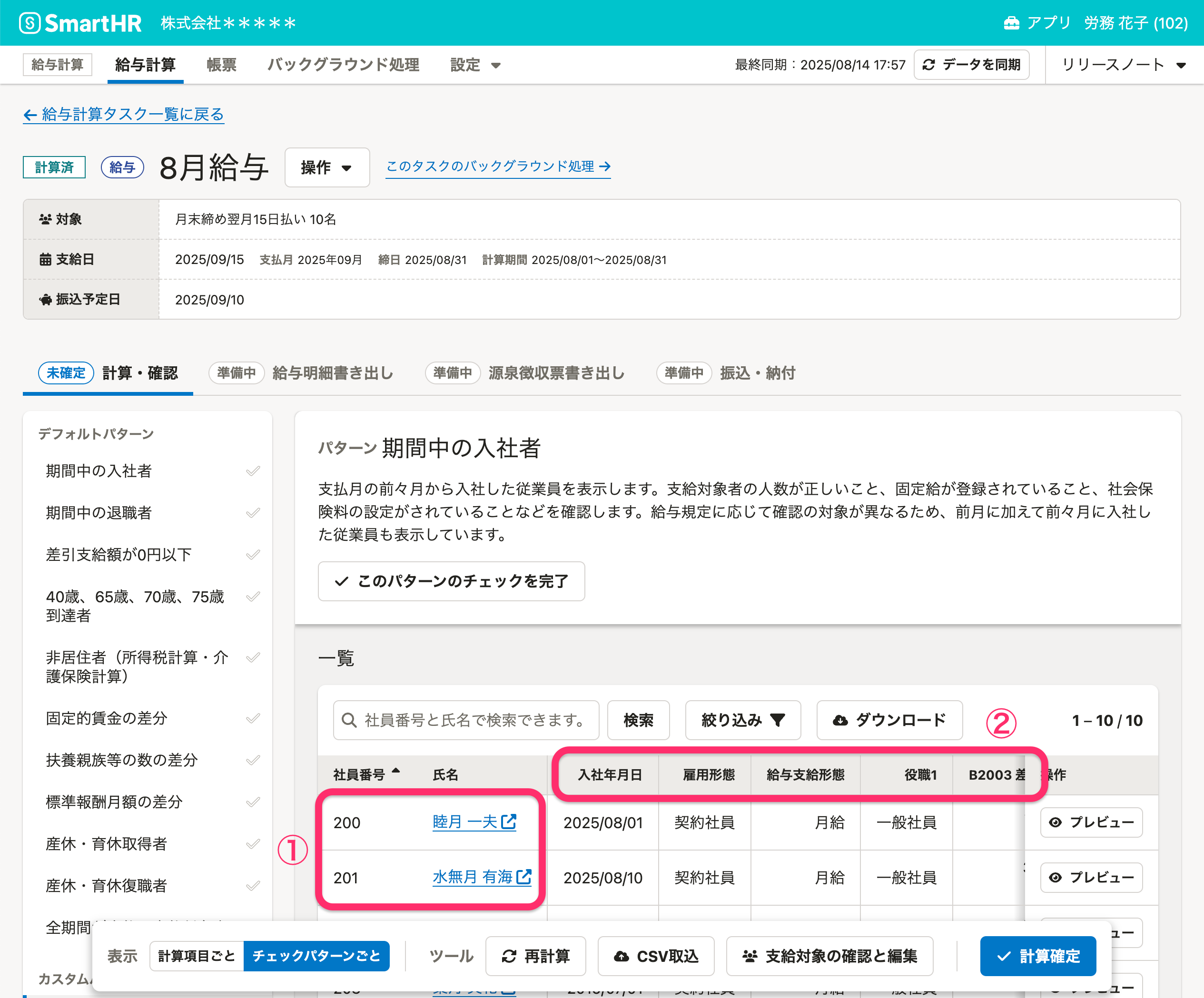 チェックパターンは、給与計算の結果を確認する際に、特定の条件に該当する従業員の給与計算項目を一覧で表示する機能です。入退社した従業員や、社会保険の区切りに年齢が達する従業員など、給与計算で特に注意すべき従業員の給与や賞与の計算結果を効率的に確認できます。