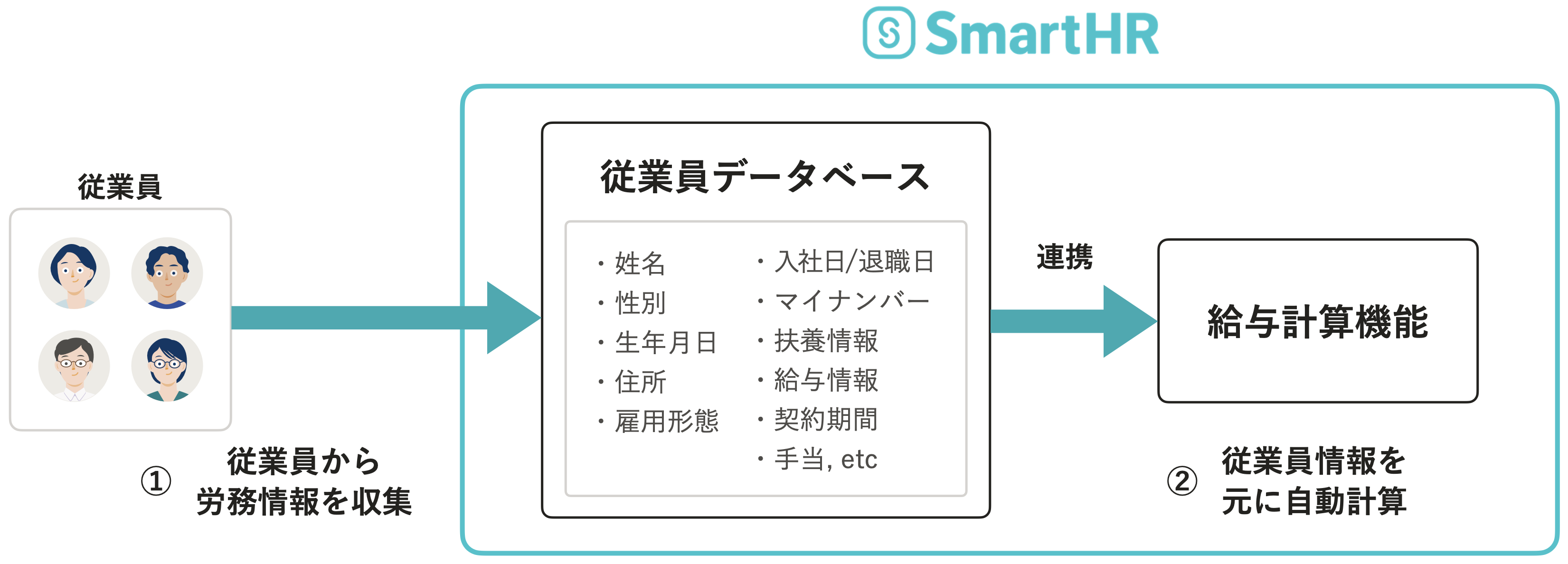 SmartHRの給与計算は、「データ入力レス」をコンセプトにした、SmartHRに蓄積された情報を活用して自動で給与計算を行なう機能です。従業員の勤怠、基本給、給与支給形態、扶養家族や、各種手当といったSmartHR上のデータを活用することで、給与計算に必要なデータの入力や連携作業を最小限に抑えます。手動での作業を減らすことで、計算ミスを減らし、効率的な給与計算を実現します。