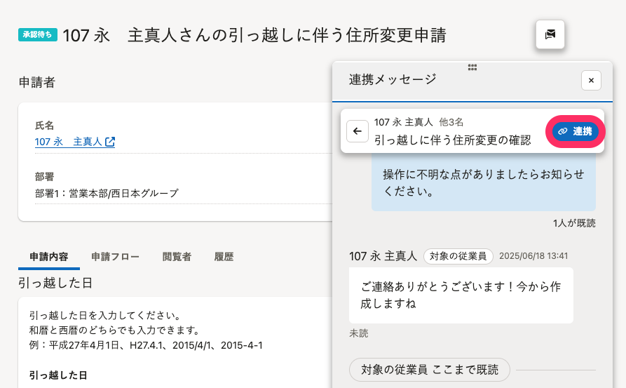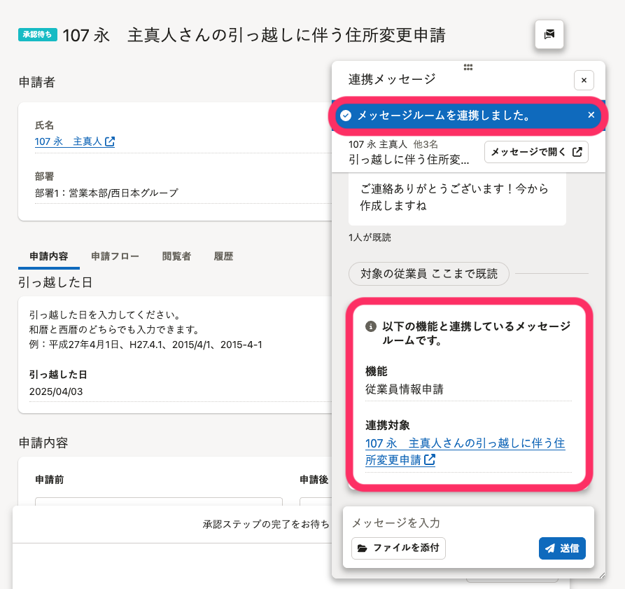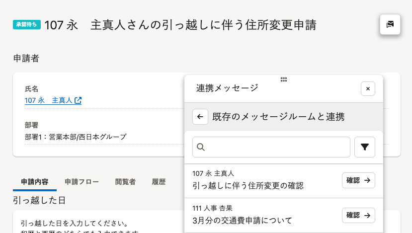 やりとり中のメッセージルームと申請を連携する