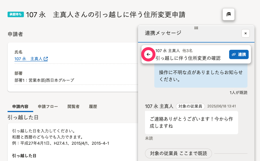 申請が連携されたメッセージルームのメンバーである 詳しくは、メッセージルームのメンバーとはを参照してください。