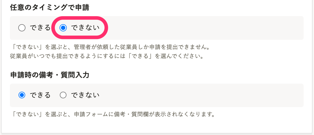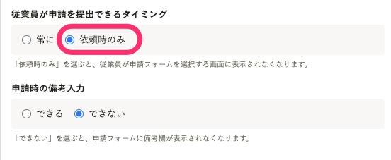 - [従業員が申請を提出できるタイミング]:依頼時のみ