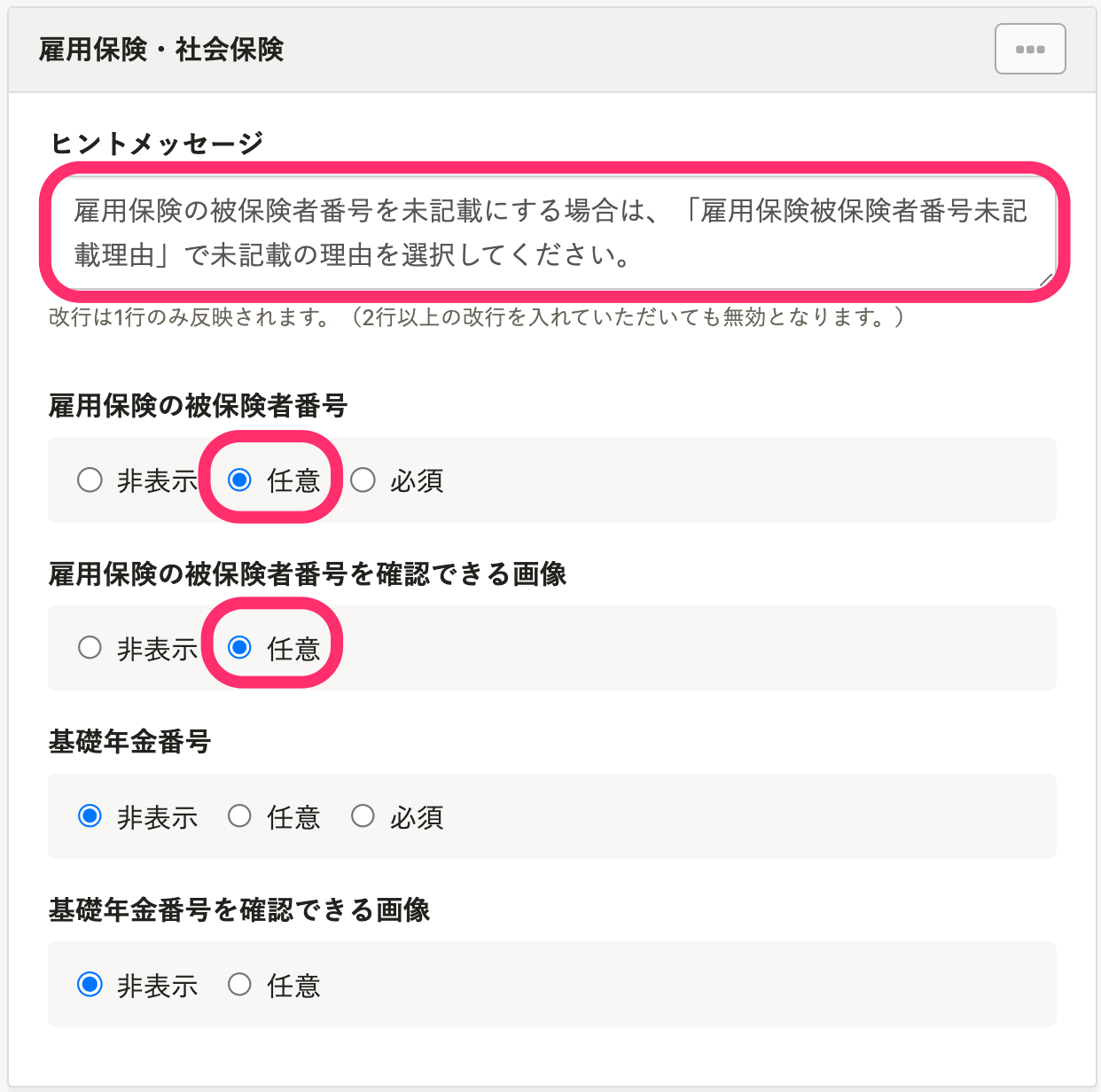 - [ヒントメッセージ]:雇用保険の被保険者番号を未記載にする場合は、「雇用保険被保険者番号未記載理由」で未記載の理由を選択してください。