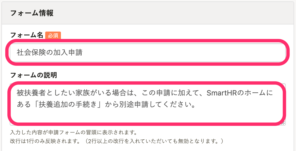 - [フォームの説明]:被扶養者としたい家族がいる場合は、この申請に加えて、SmartHRのホームの手続きウィジェットにある[扶養家族の追加]から別途申請してください。