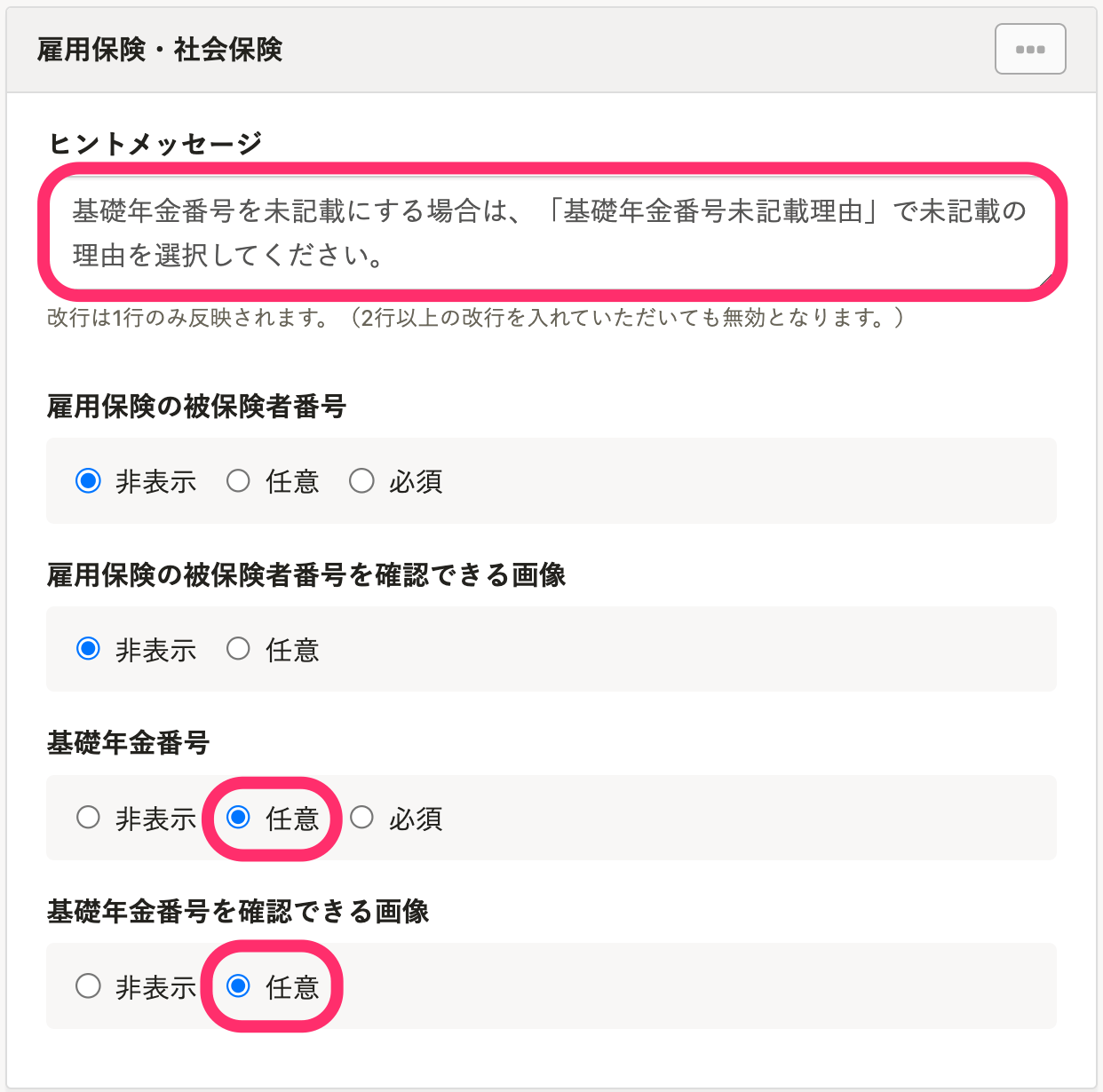 基礎年金番号を未記載にするケースを想定し、ヒントメッセージで未記載の理由を選択するよう促します。
