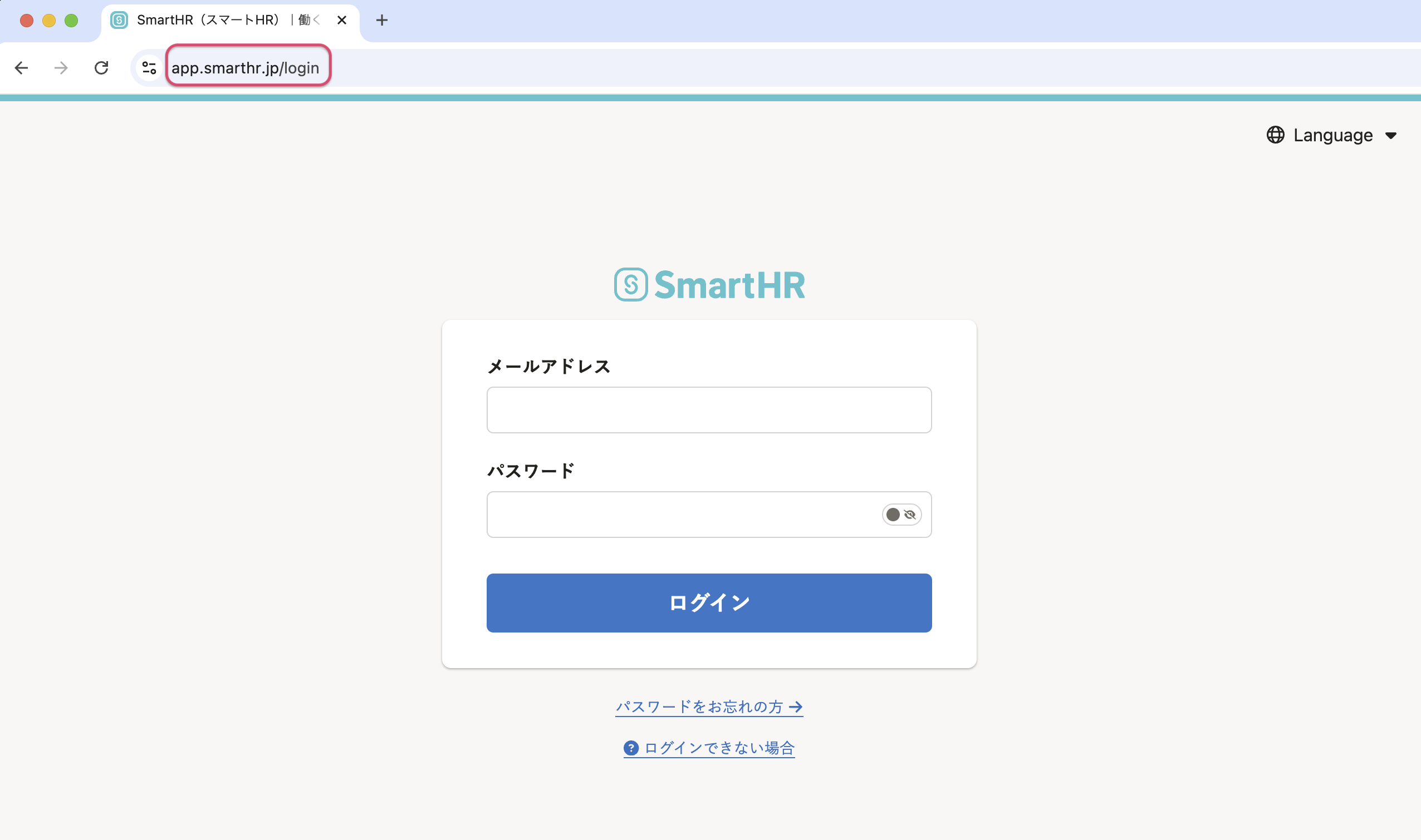 共通ログイン画面のURLは https://app.smarthr.jp/login で、ログインにはメールアドレスを使用します。