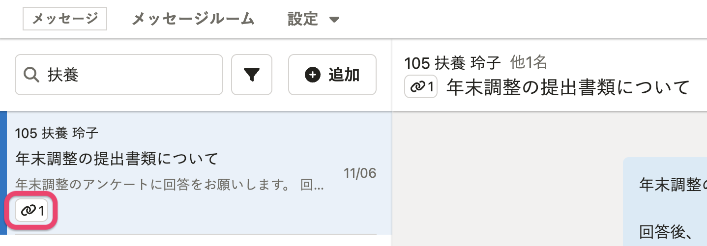他機能と連携済みのメッセージルームには、リンクアイコンが表示されます。数字は連携しているデータ数です。