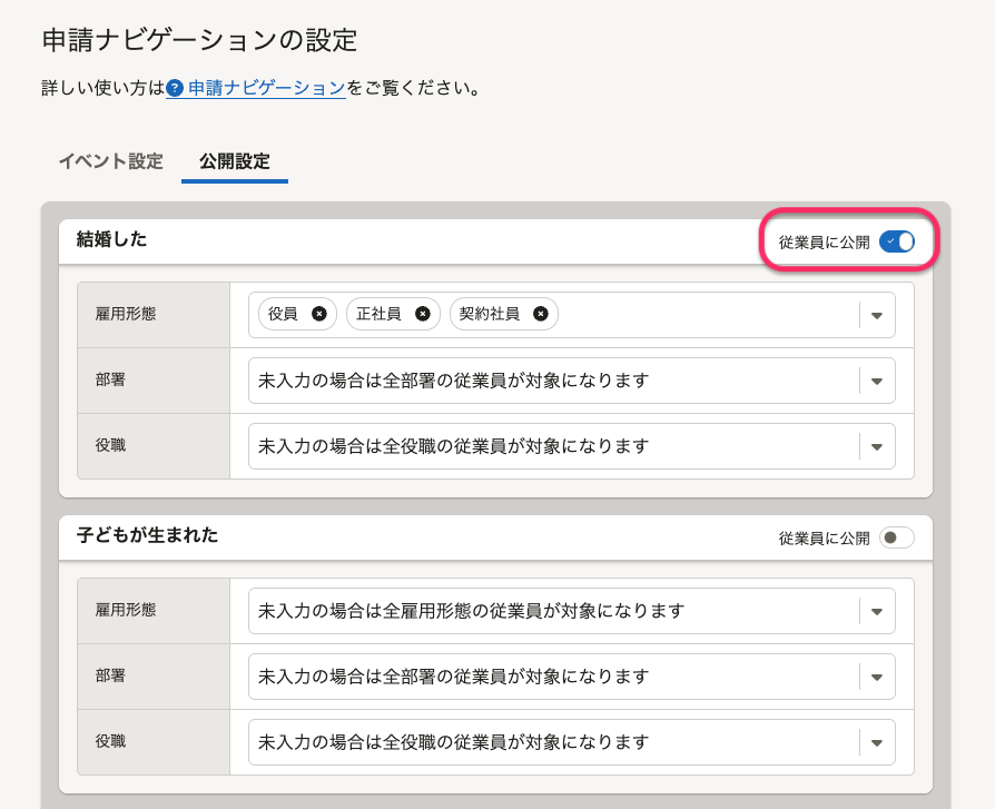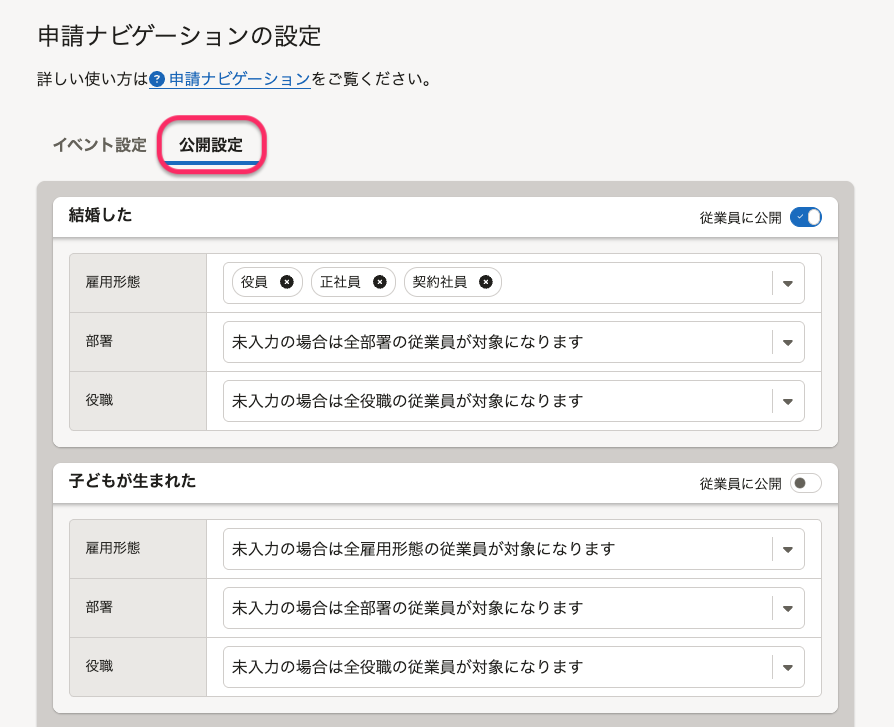 申請ナビゲーションの設定画面で、[公開設定]を押すと、公開設定画面が表示されます。