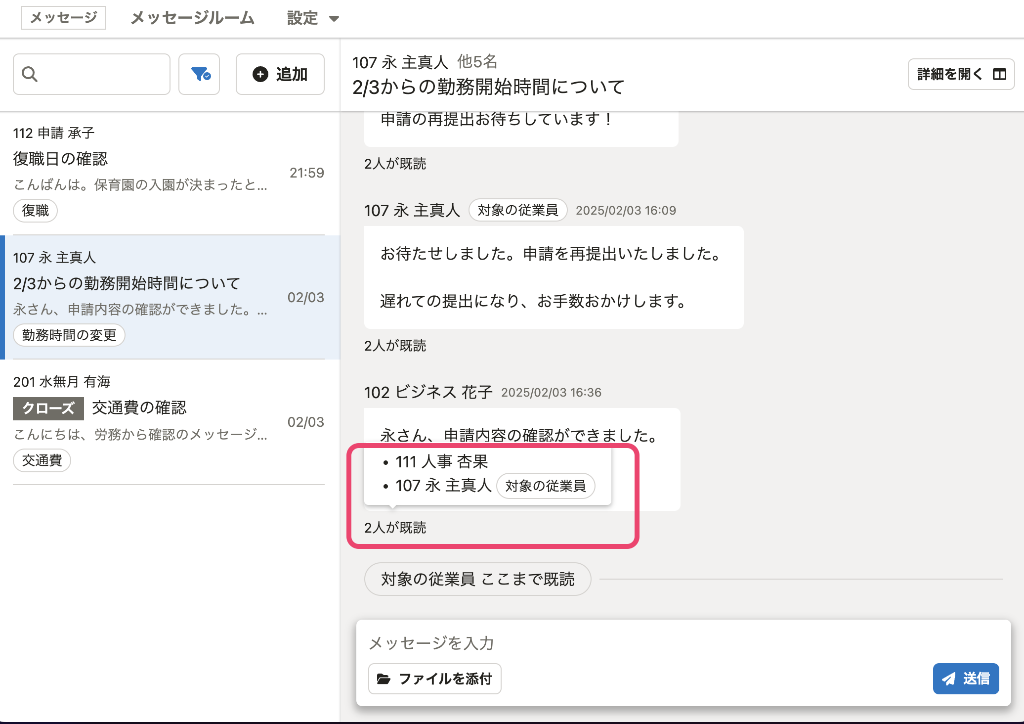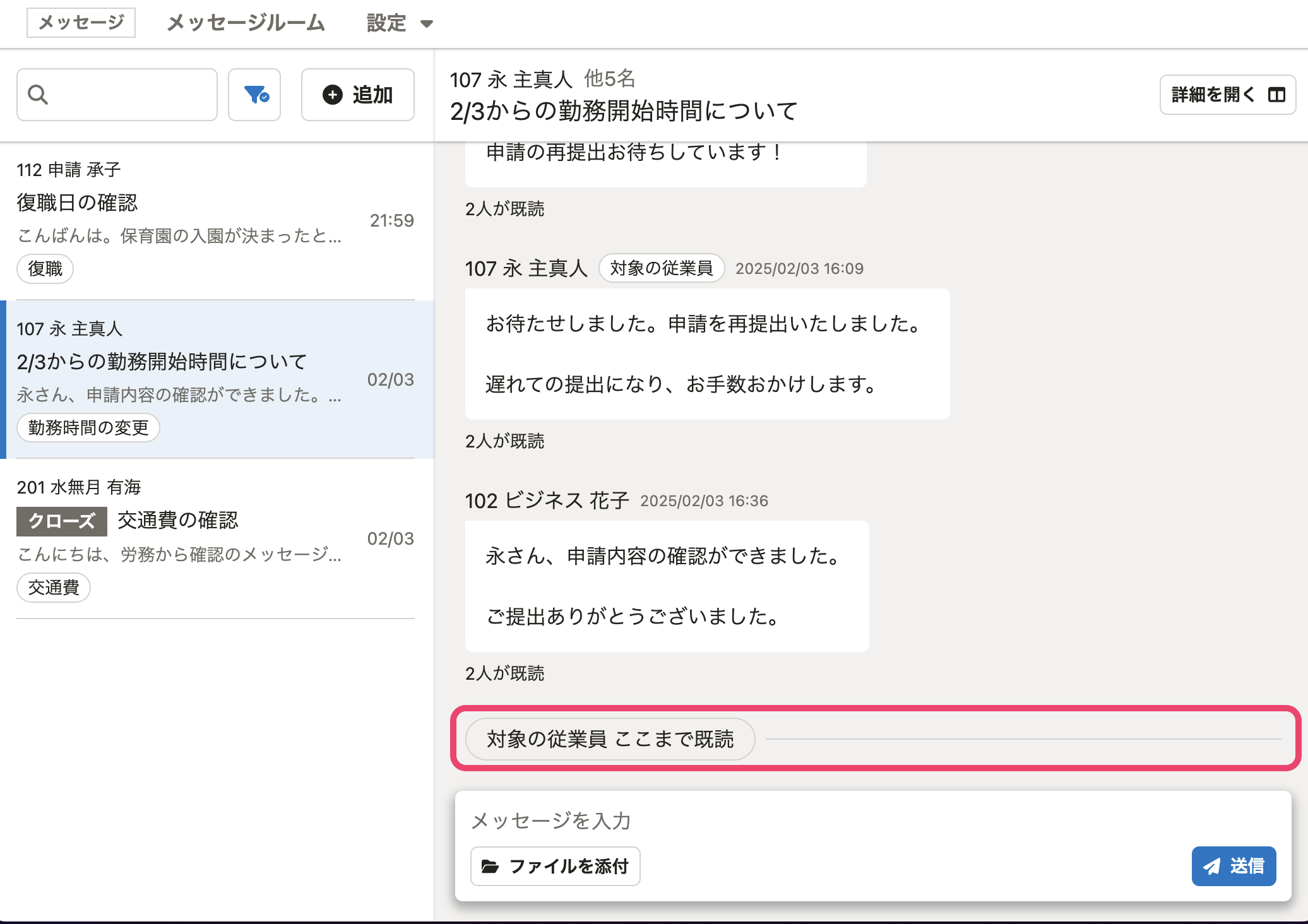 メッセージルームの詳細画面で、対象の従業員 ここまで既読の表示を確認します。