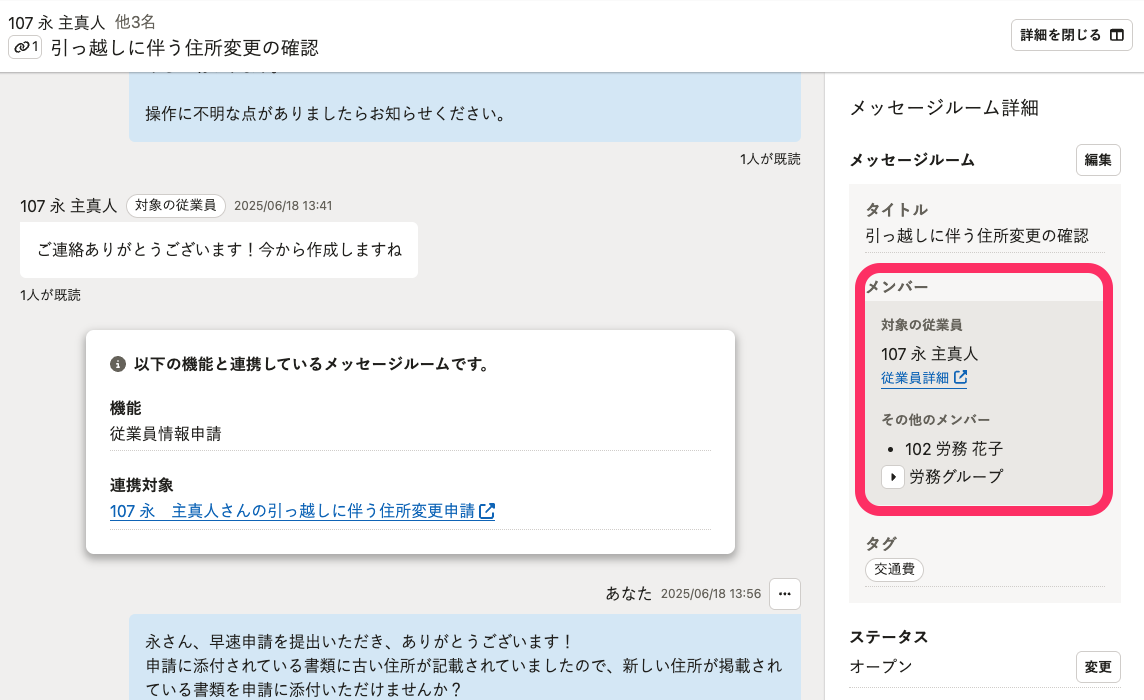 メッセージルームのメンバーは、メッセージルームの詳細パネルでも確認できます。